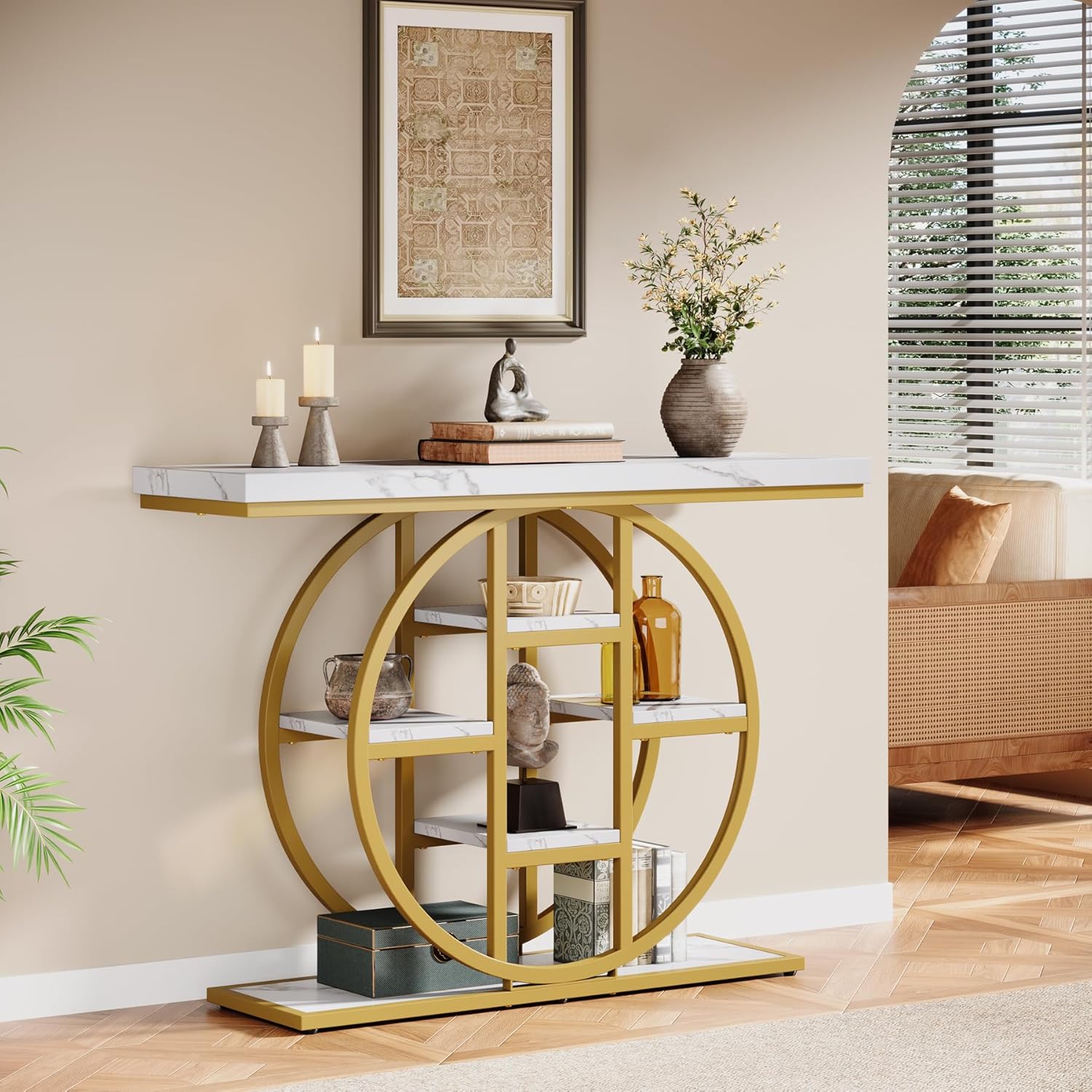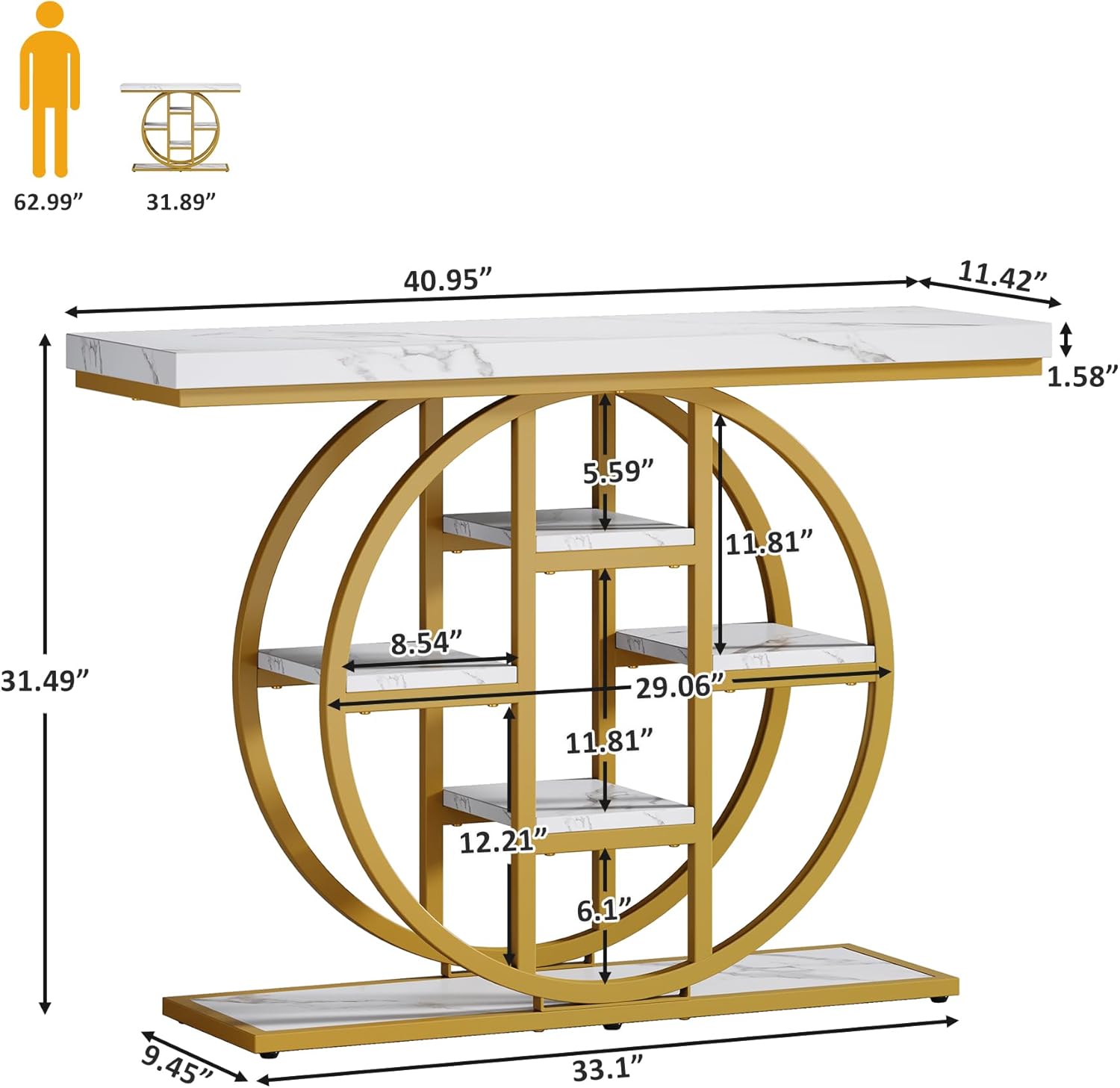 41" Console Table, 4-Tier Entryway Table with Circle Base, Industrial Narrow Wood Sofa Accent Tables with Storage Shelves for Living Room, Hallway, Foyer (White Gold)