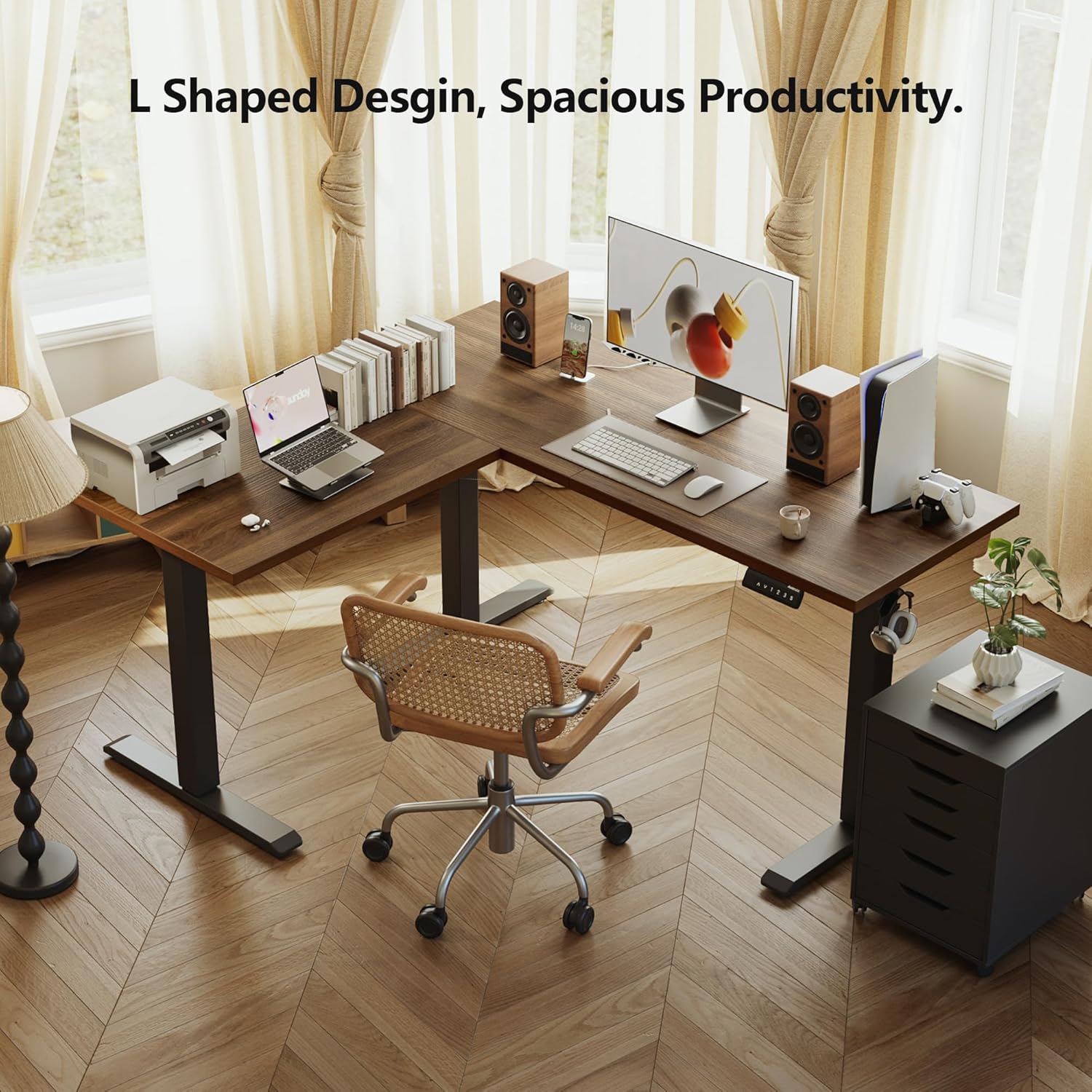 - 【Ample Workspace】59*47.2" L shaped adjustable height desk is perfect for home office and gaming by providing large space. It can easily holds 3 desktop PCs, 1 laptop, and other office accessories.