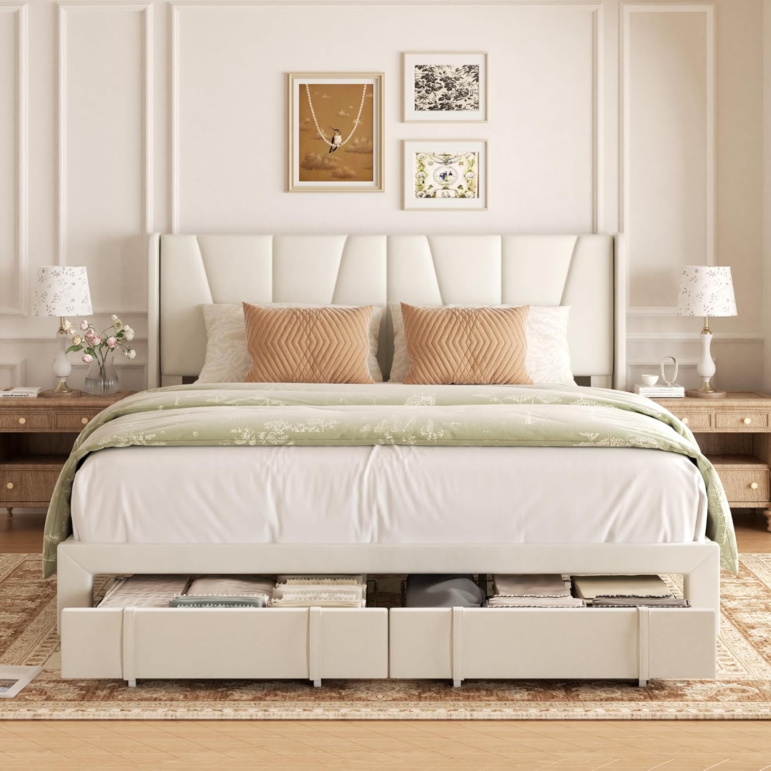 King Bed Frame with Storage Drawers, Upholstered Platform Bed with Headboard and Wingboard, No Box Spring Needed, NO Noise, Easy Assembly, Wooden Support Slats, Beige