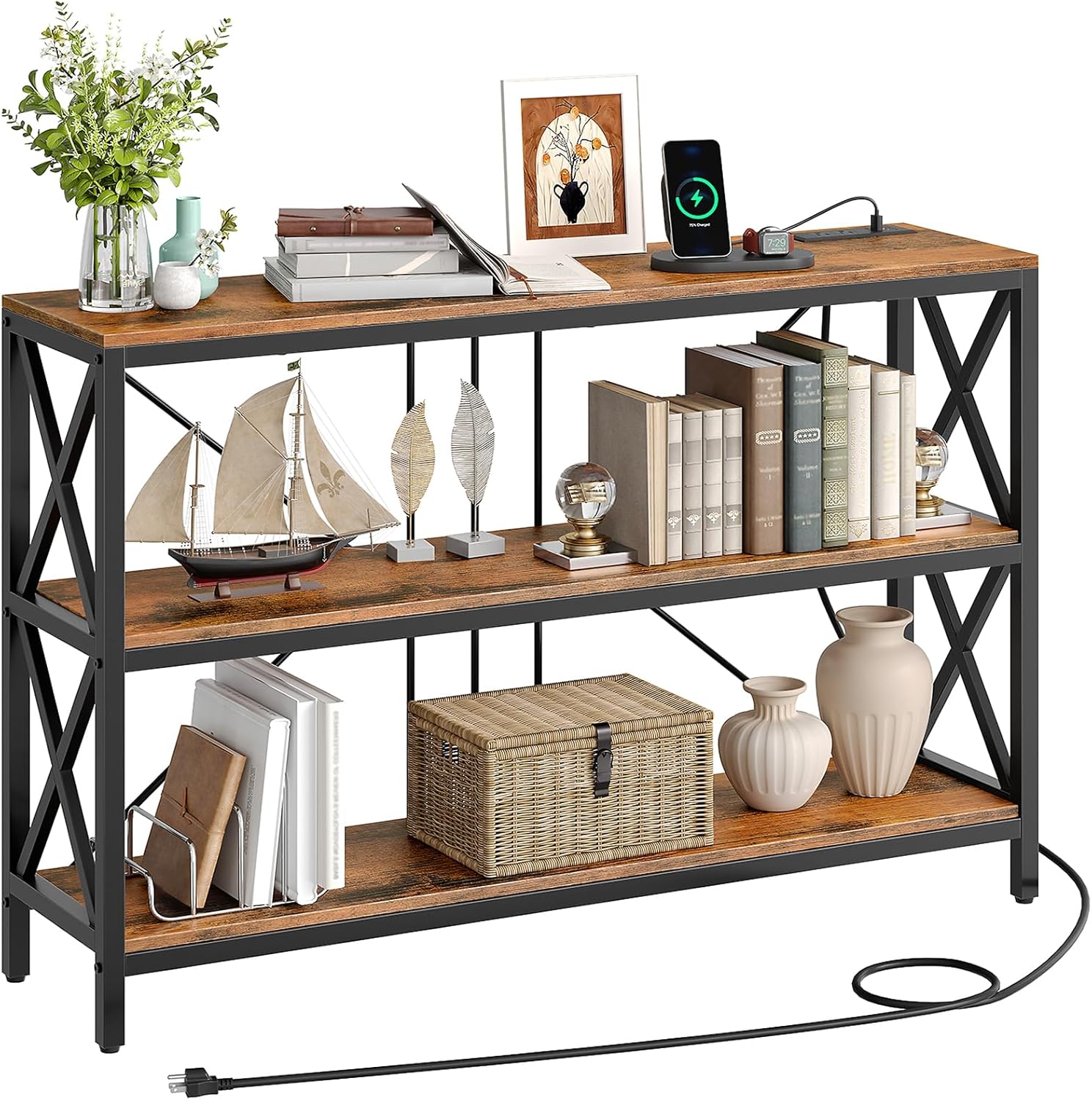47.2" Console Table with Charging Station, 3-Tier Entryway Table, Industrial Sofa Desk, Hallway Desk with 2 AC Outlets and 2 USB Ports Metal Frame, Rustic Brown and Black TXG01UBF