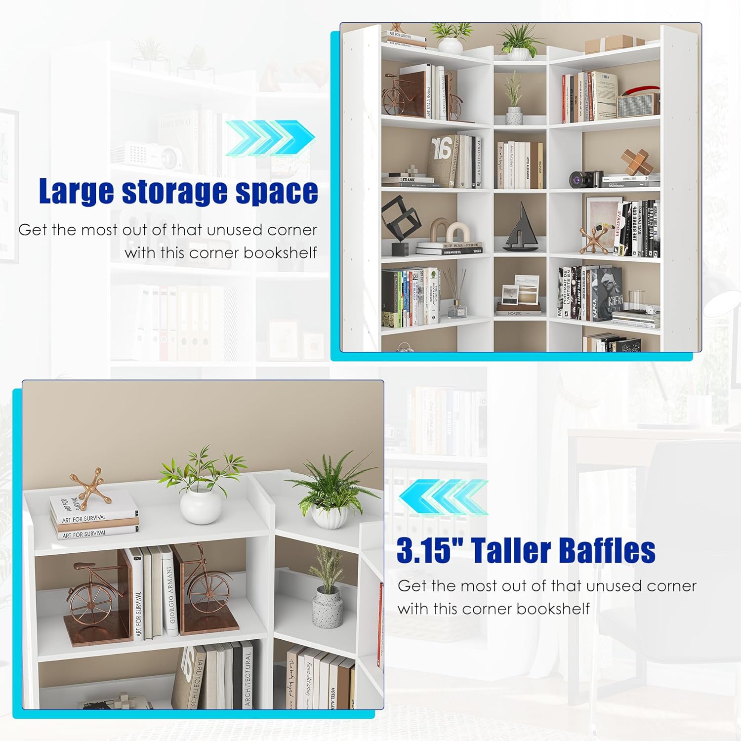 - Premium Material: This tall corner bookshelf is crafted from premium scratch-resistant MDF boards to ensure long-lasting durability for daily use. Each tier can support up to 80 pounds, offering abundant storage space