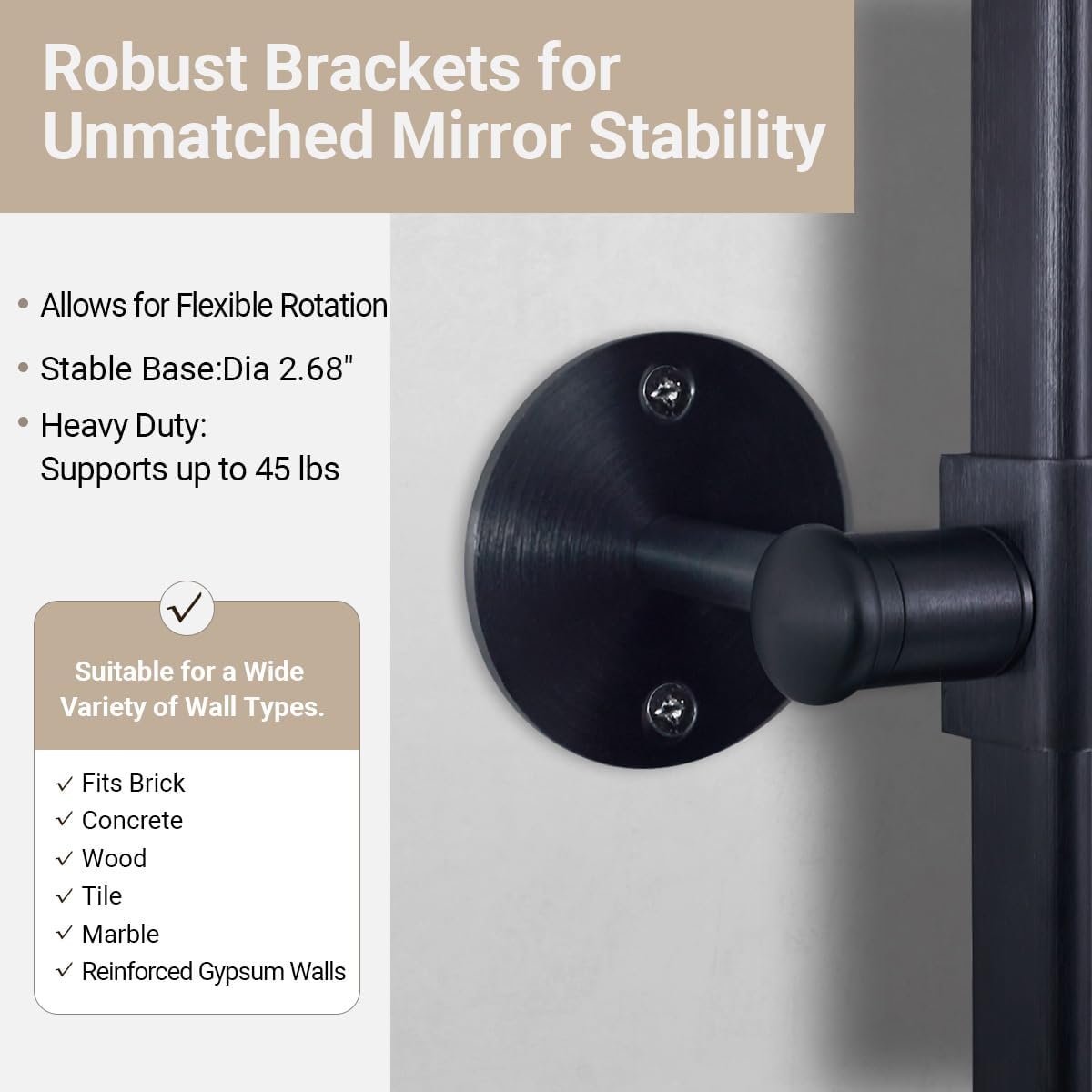 - Adjustable Tilt Design: The black pivot mirror features dual brackets that blend style and functionality; it adjusts 16° up/down to fit various heights. Durable anchors and screws with the brackets prevent loosening, slipping, or rusting