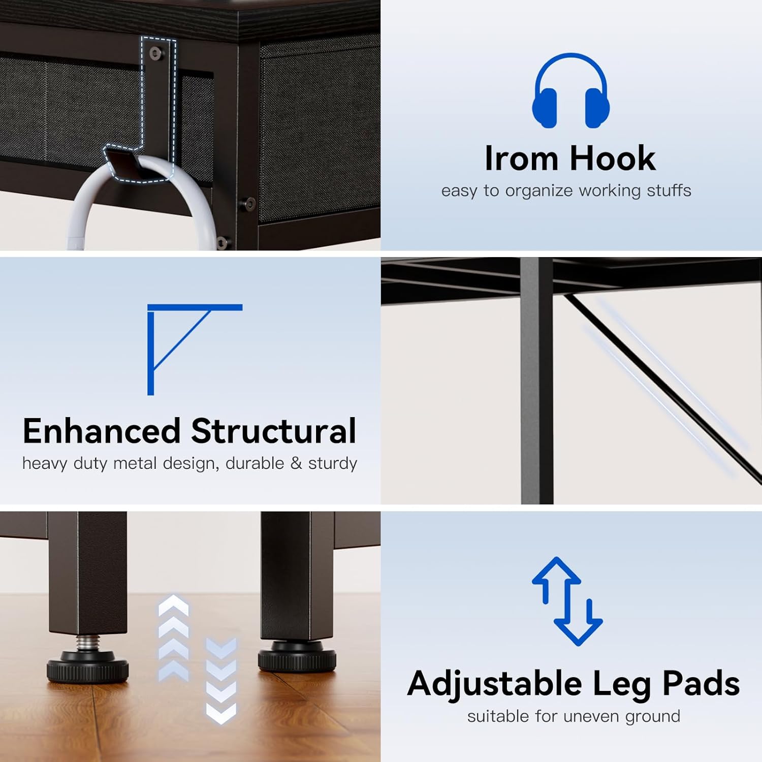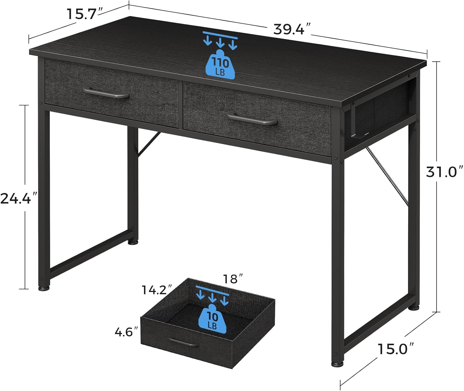 - Practical Storage with 2 Fabric Drawers. This desk features 2 durable fabric drawers, offering convenient storage for office supplies, books, or personal items. Keep your workspace organized and clutter-free while maintaining easy access to essentials.