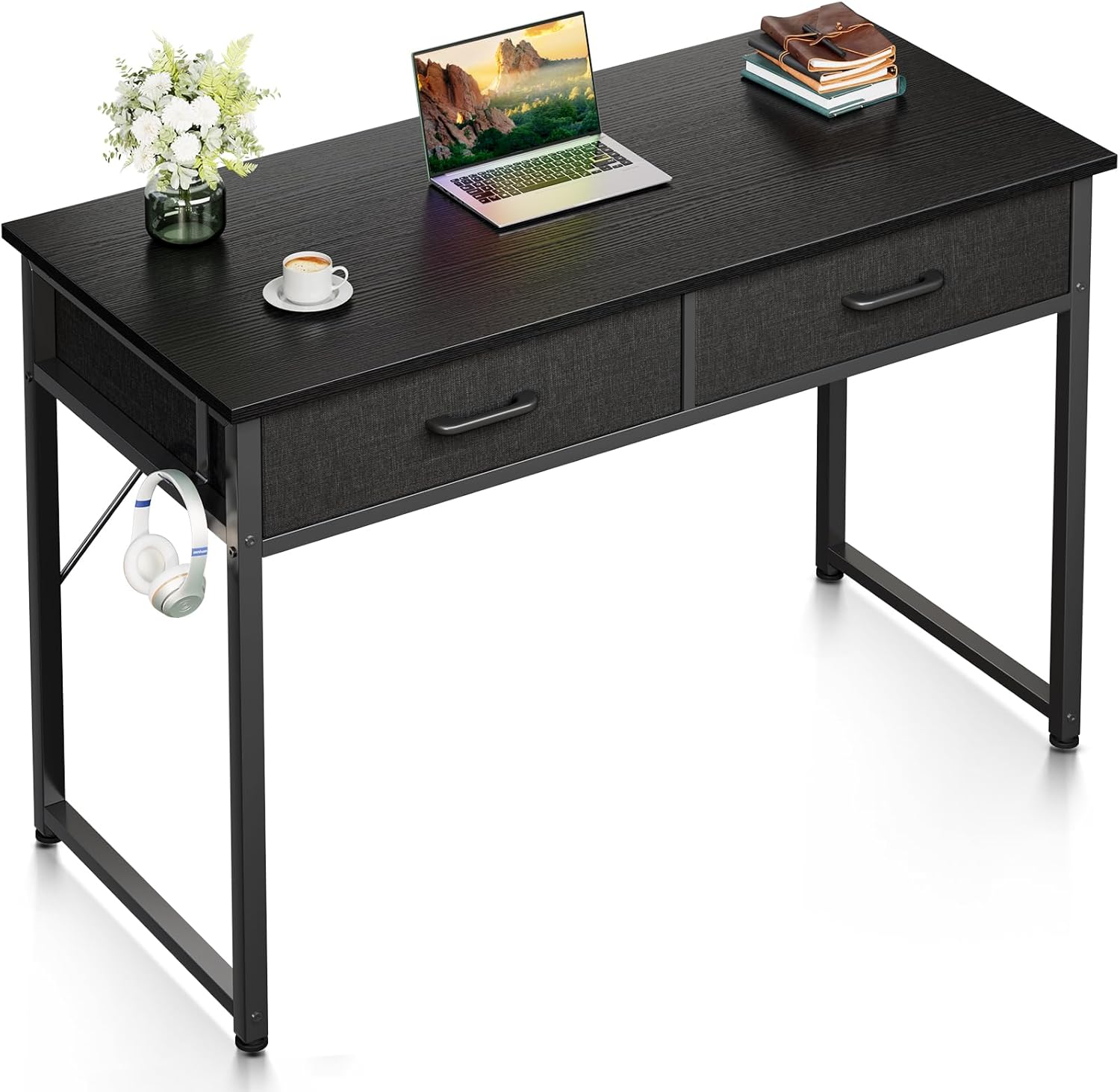 Casaottima 40 Inch Small Office Computer Desk with 2 Drawers & Headphone Hook - Compact Writing Desk for Home Office, Study or Work, Modern Space-Saving Design for Small Spaces, Black