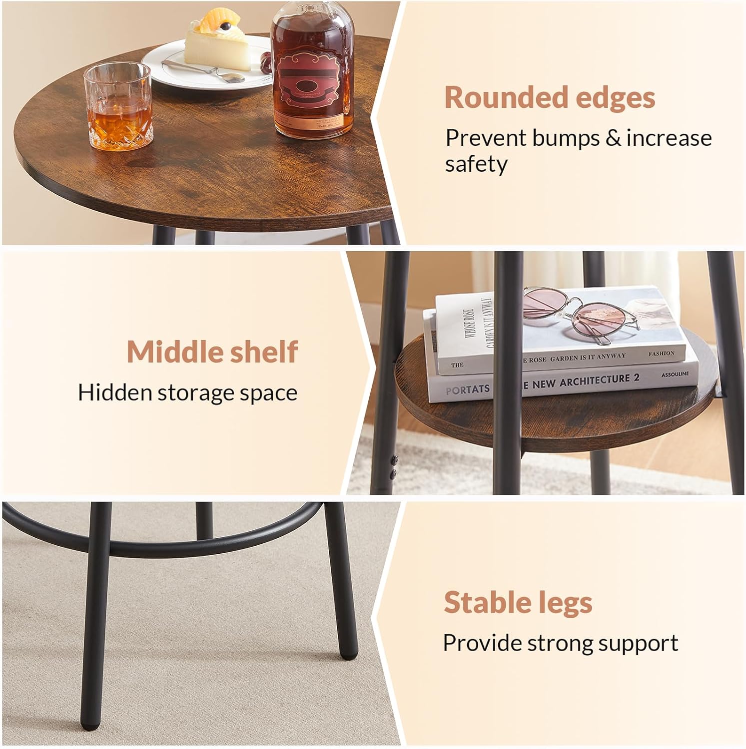 - 【Pub Table and Chairs Set of 2】Retro design 3-piece set including 1 round table and 2 matching rounded stools. The round table has a 13.2" wide circular shelf in the middle for wine glasses, lighters, bottle openers, etc. Suitable for family dining, social activities or office.