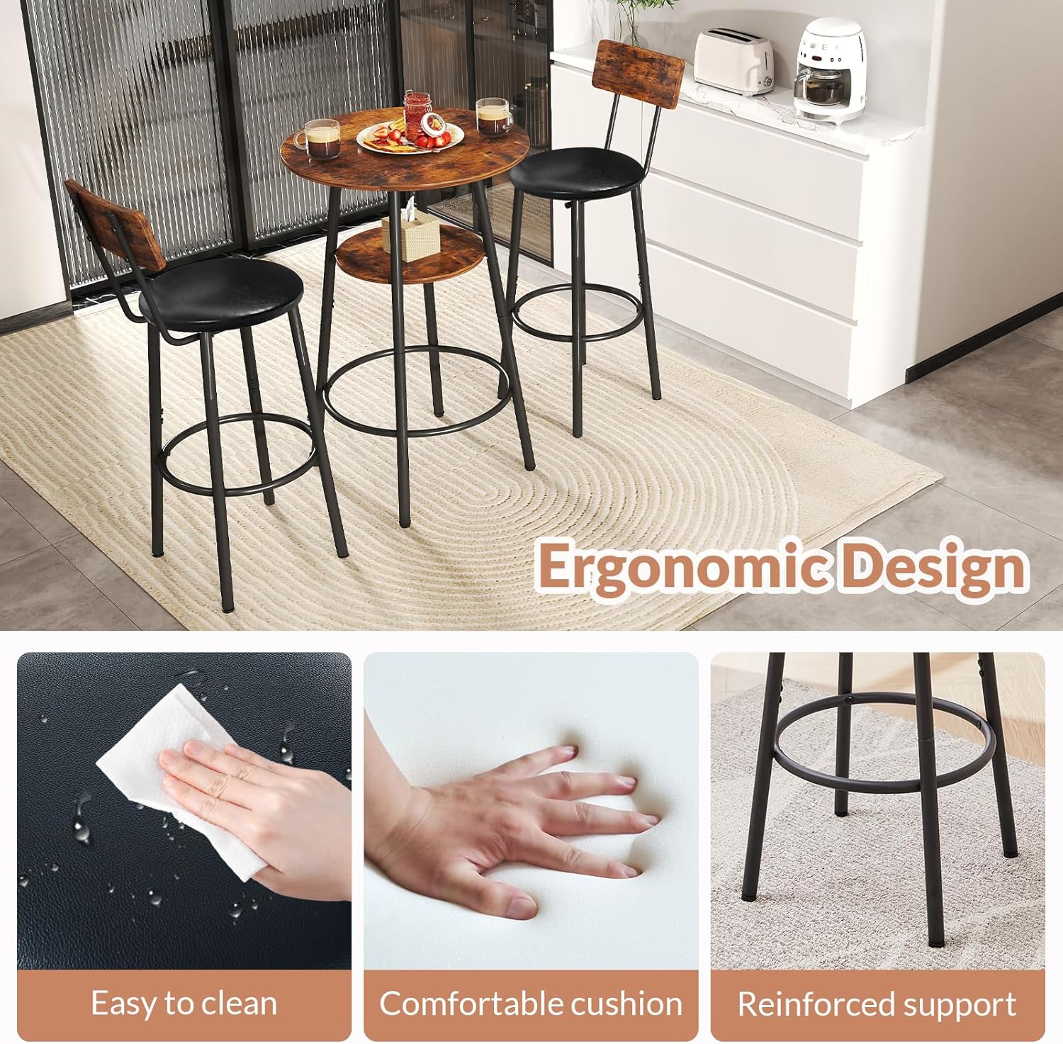 - 【Easy Installation & Clean】Our bar table and chairs set of 2 comes with all the parts and hardware you need and clear assembly instructions. Seats are upholstered in PU leather for a retro look.They can be easily spot cleaned with a damp cloth.
