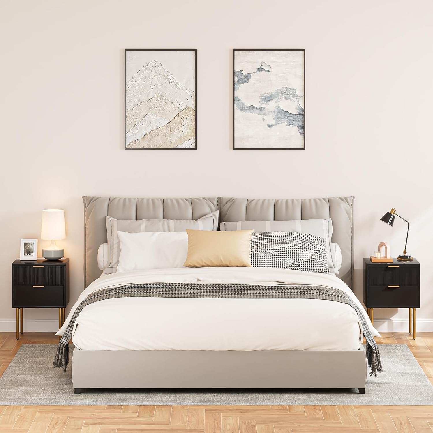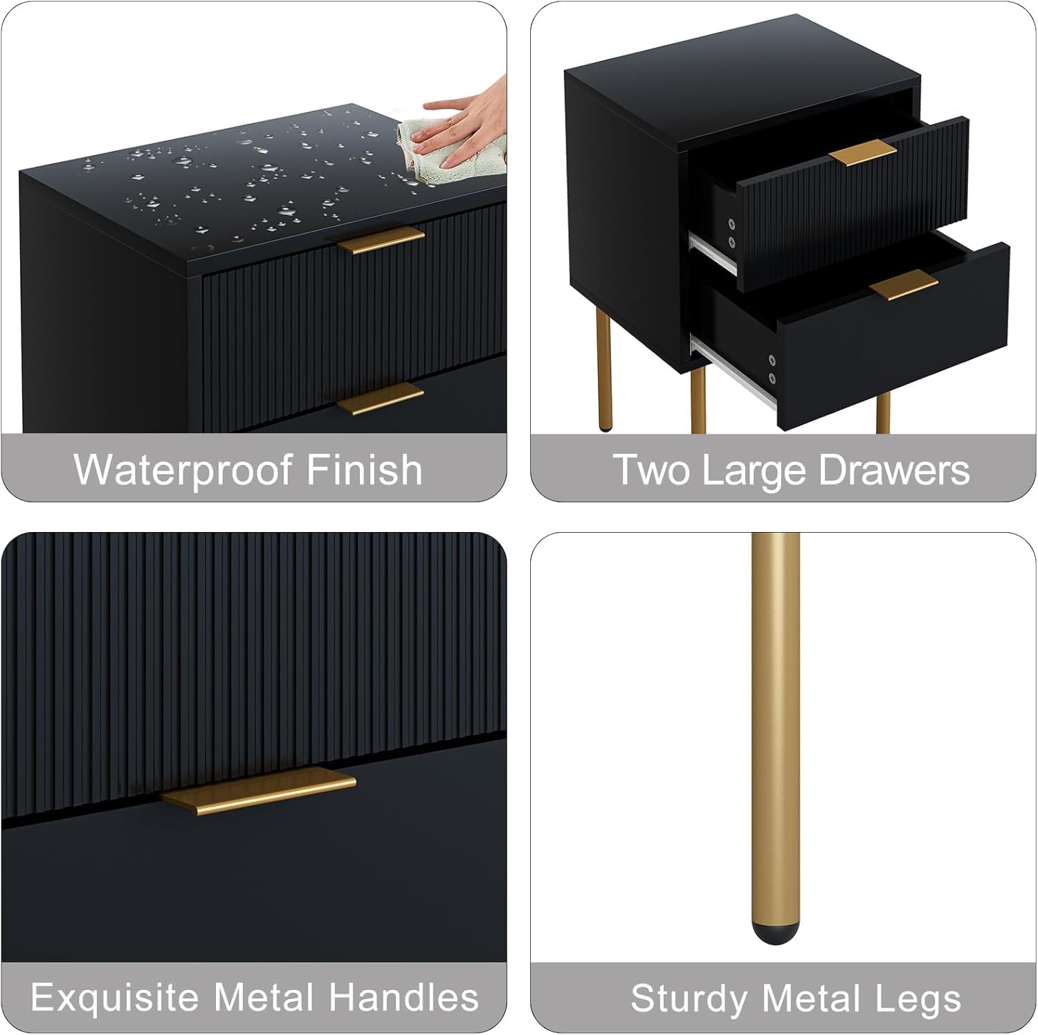 Nightstand,Small Bedside Table with Gold Frame,Morden Night Stand with 2 Drawer,End Table,Side Table with Drawer and Shelf for Bedroom,Living Room, Black