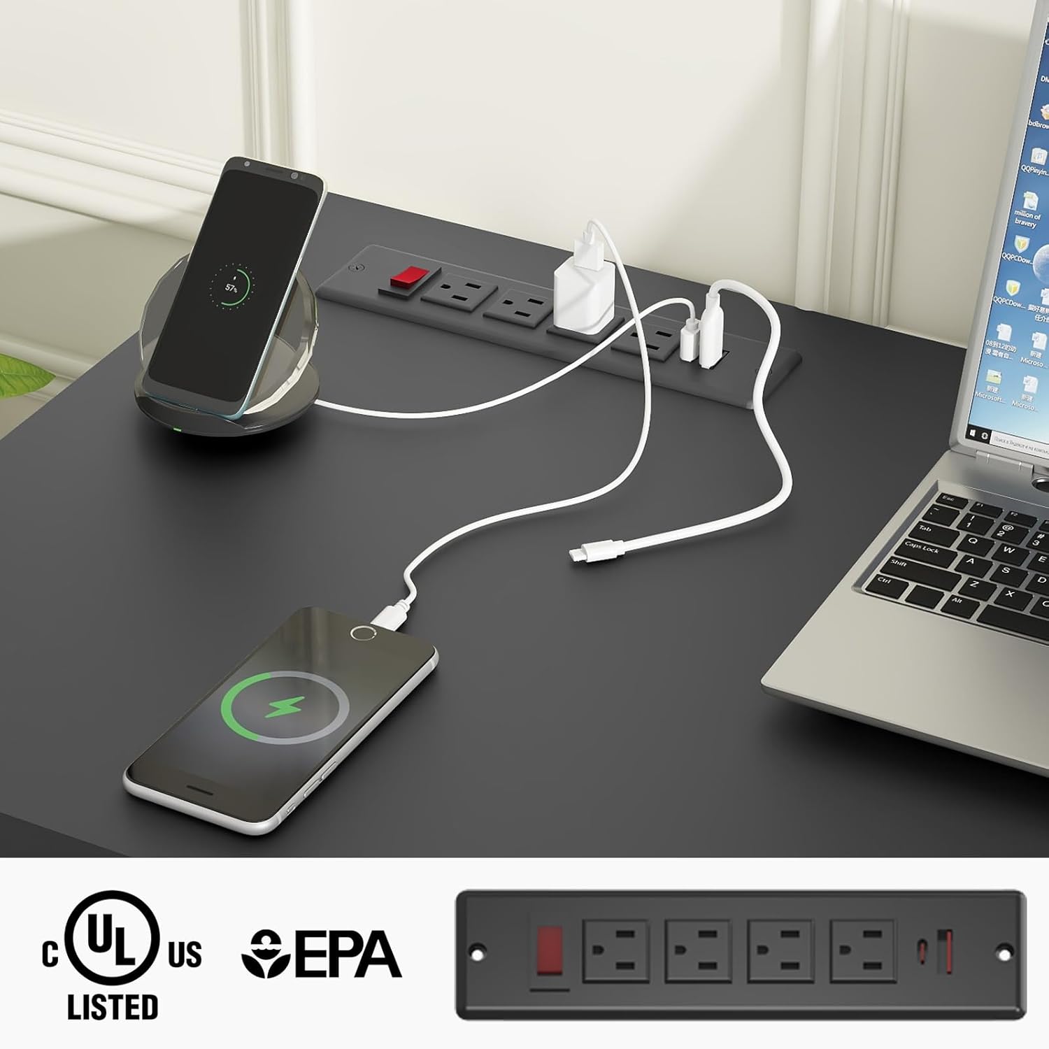 - 【Convenient Charging Hub】Our desk features a convenient charging station with 4 outlets and 2 USB ports, capable of powering up to 6 devices simultaneously. The included on-off switch ensures safe electricity usage and offers a one-button power-off function for added security. Perfect for charging cell phones, tablets, laptops, and other electronic devices, this charging hub keeps your workspace tidy and organized.
