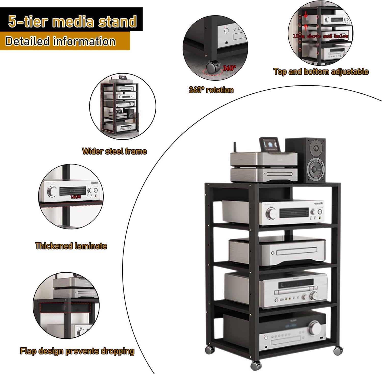 5 Tier Audio Rack Tower, CD Record Player Stereo Receiver AV Equipment Cabinet Display Rack, Weight Capacity 220 lbs, with Adjustable Wooden Shelves for Home (Black-2, 5tier)