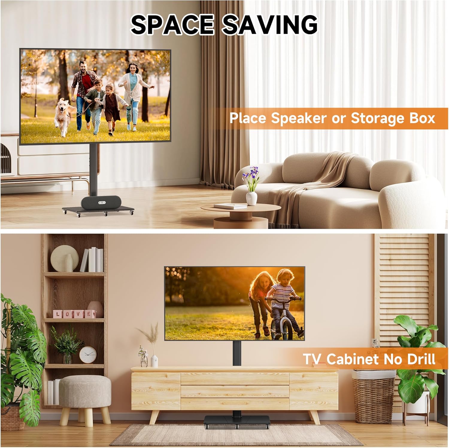 - ROLLING CART:With 5 smooth rolling casters, you can move your TV to anywhere you need easily. No drill and not fixed in one place, flexible to adjust the layout of your room.