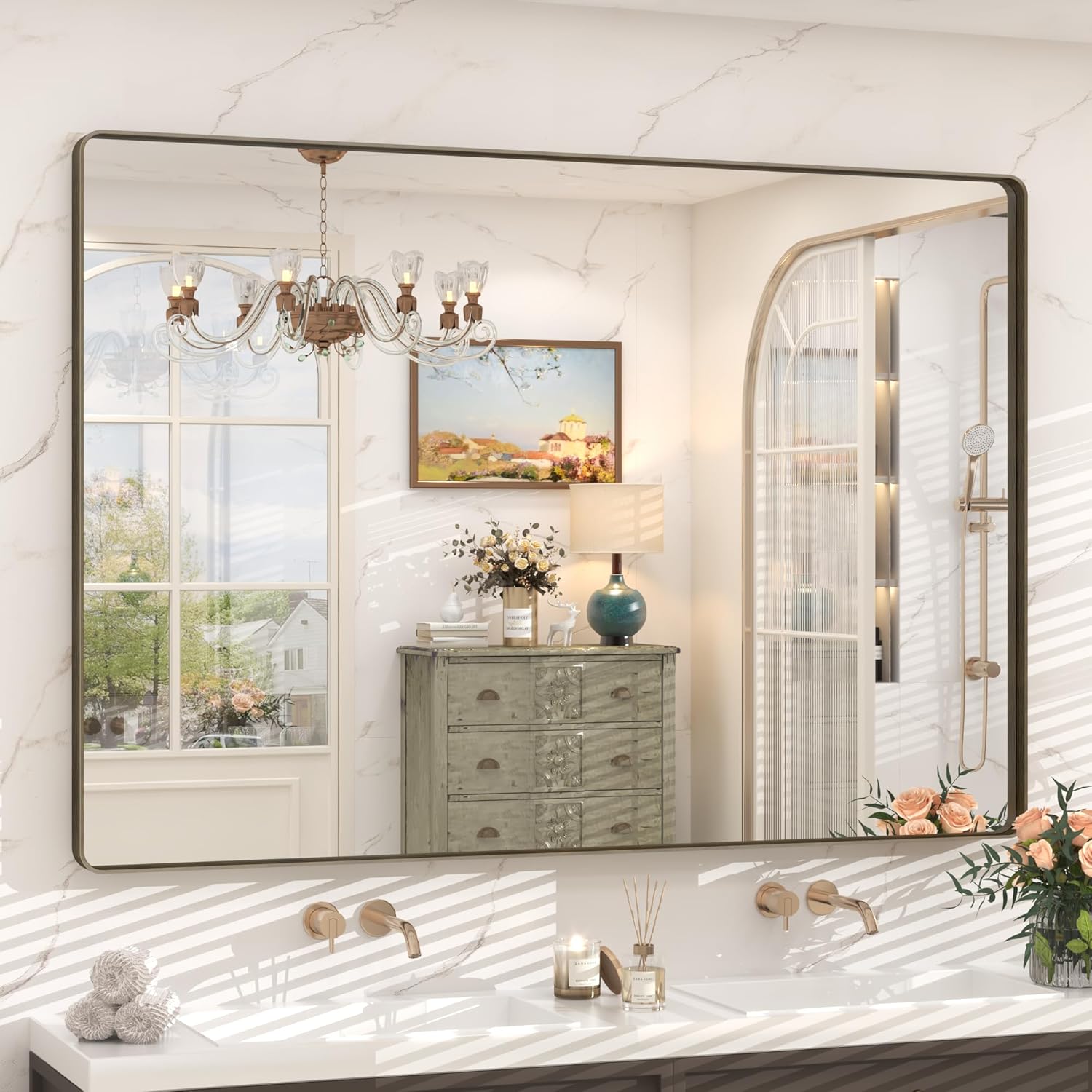 55x36 Bronze Bathroom Vanity Mirror for Wall, Large Bronze Frame Mirror with Brushed Metal Frame, Rounded Rectangle Mirror, Shatterproof, Anti-Rust (Horizontal/Vertical)