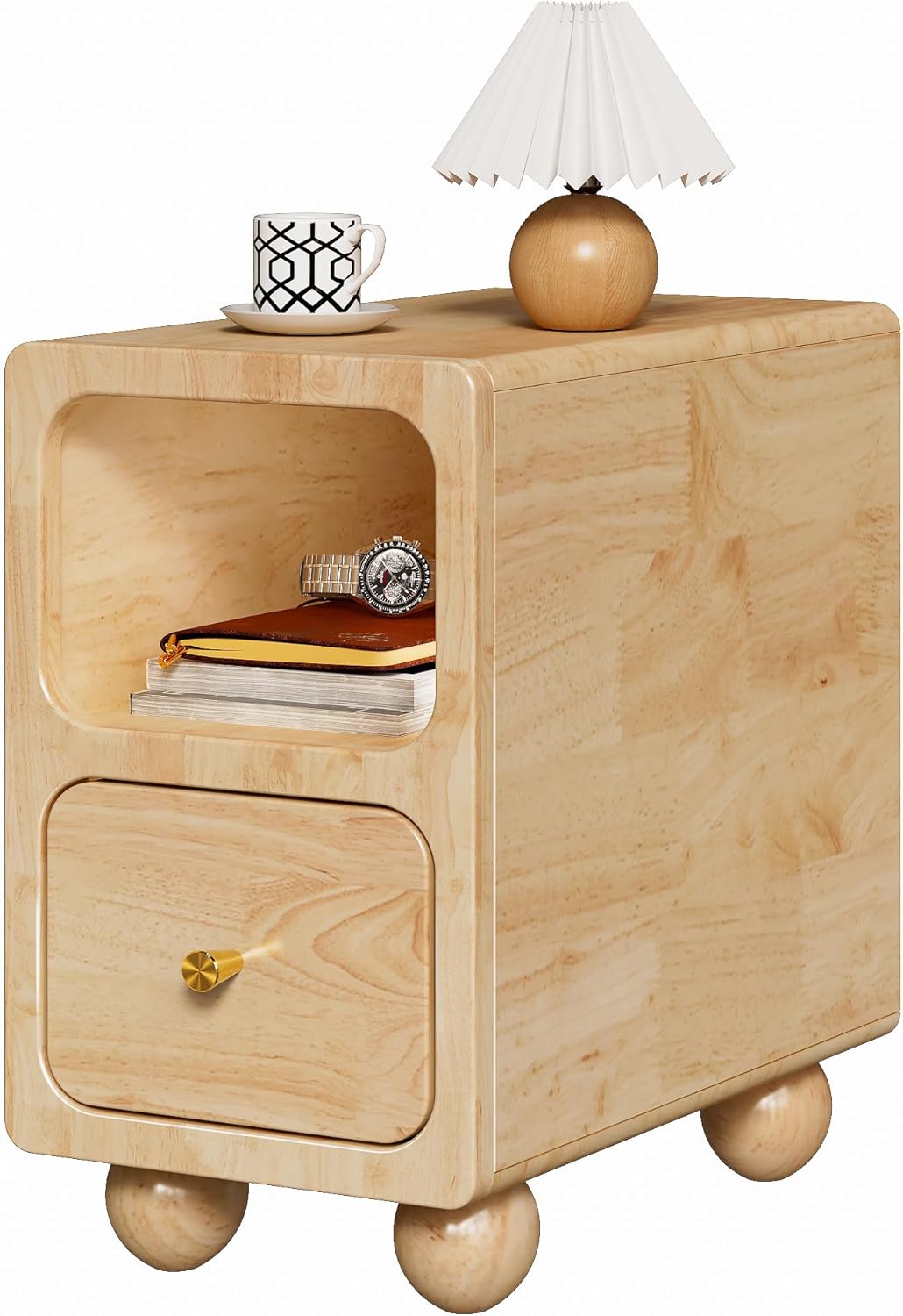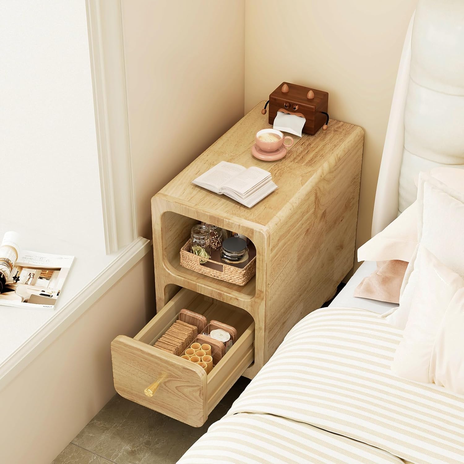 Solid Wood Night Stand, Narrow Nightstand with Drawers, Natural Mid Century Modern Nightstand, Small Beside Table with Open Storage Shelf for Bedroom (10 inch)