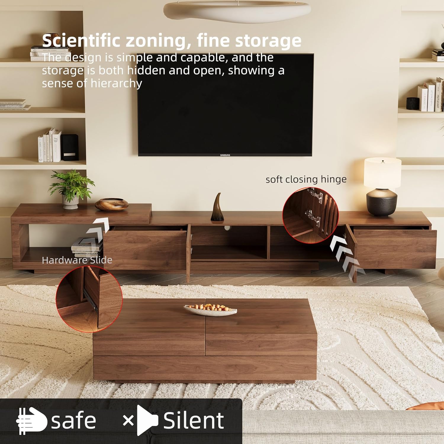 - Ample Storage:With 2 spacious storage compartments and 2 drawers,this TV stand is perfect for tucking away clutter and keeping your living area organized.Whether displaying decor or storing media accessories,this versatile piece combines style and practicality,making it an ideal addition to any home,And more open space will be available in both side when you strech the cabinet.