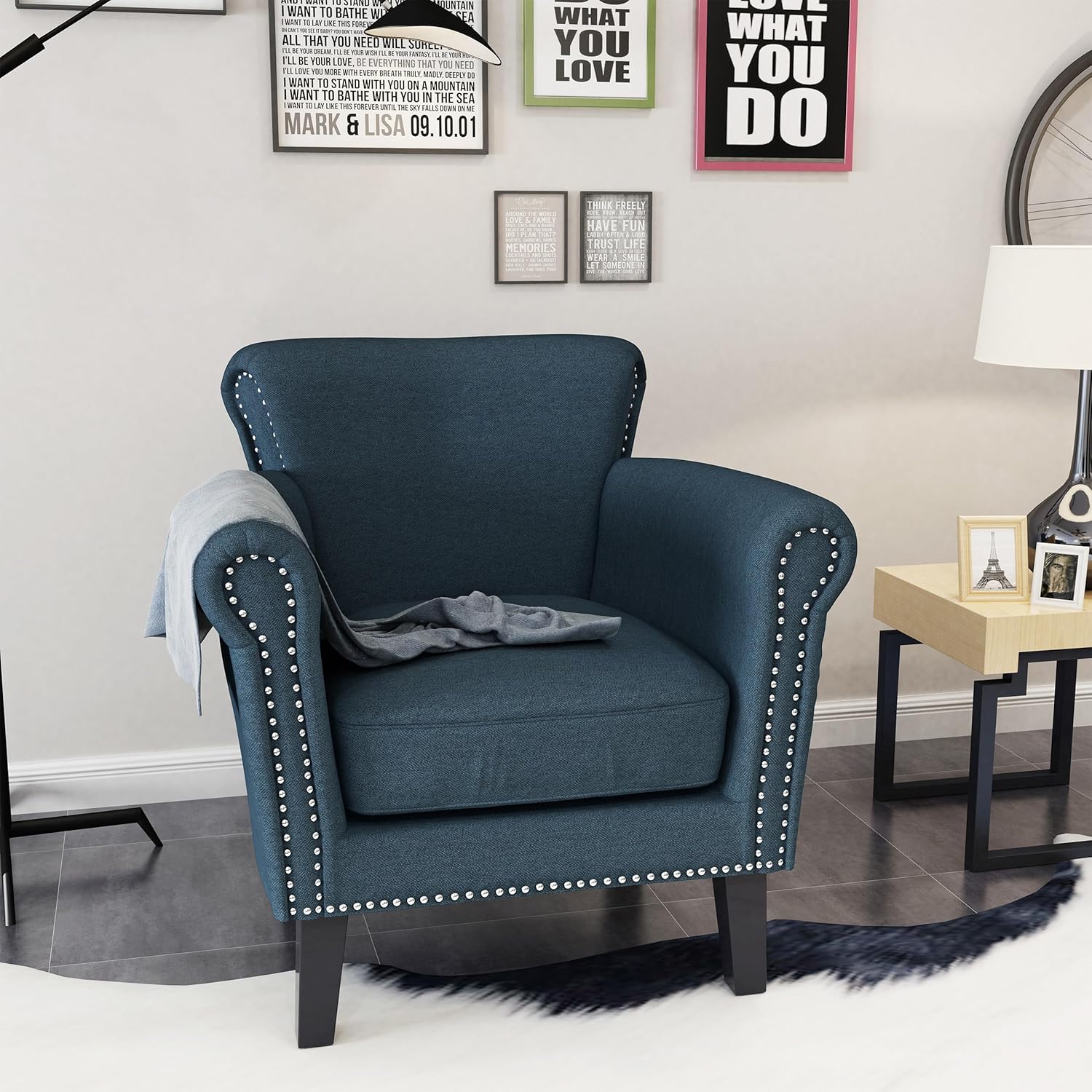 Ball & Cast Upholstered Living Room Chairs,Luxury Curved Design with Nailhead Trim and Subtly Rolled Armrests,Comfy Accent Chair Seating Furniture for Bedroom,Navy Blue