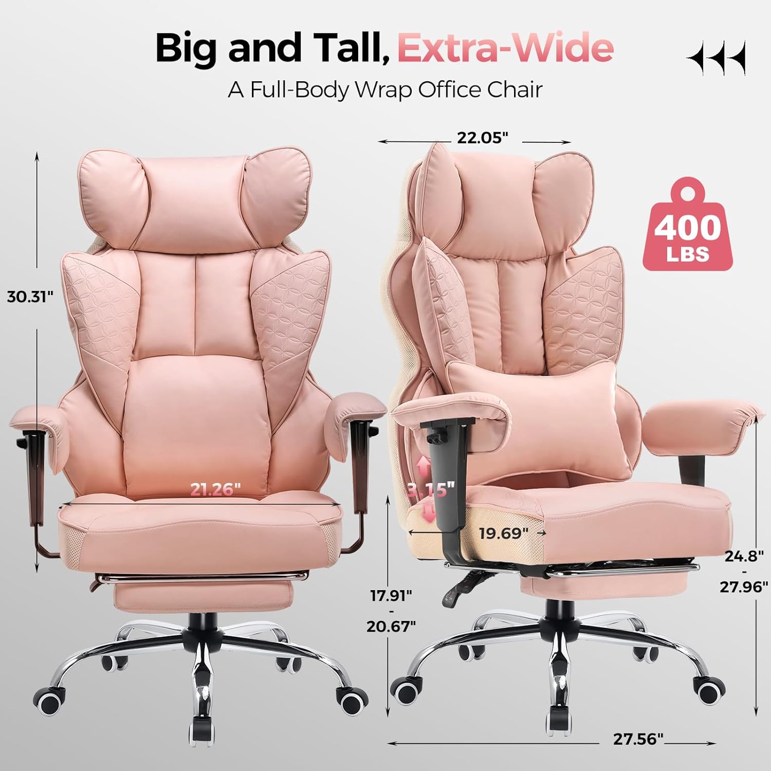 - 【400LBS Big and Tall Office Chair】Designed specifically for heavy people, Thicken and enlarged size headrest greatly improves the contact area perfectly supporting your head and neck.The prominent sides of the backrest wrap around your back better to support it on both sides and reduce pains and pressure. 400lbs weight capacity fit people with different height and body type. Even if you are big and tall, you also can get a comfortable sitting experience