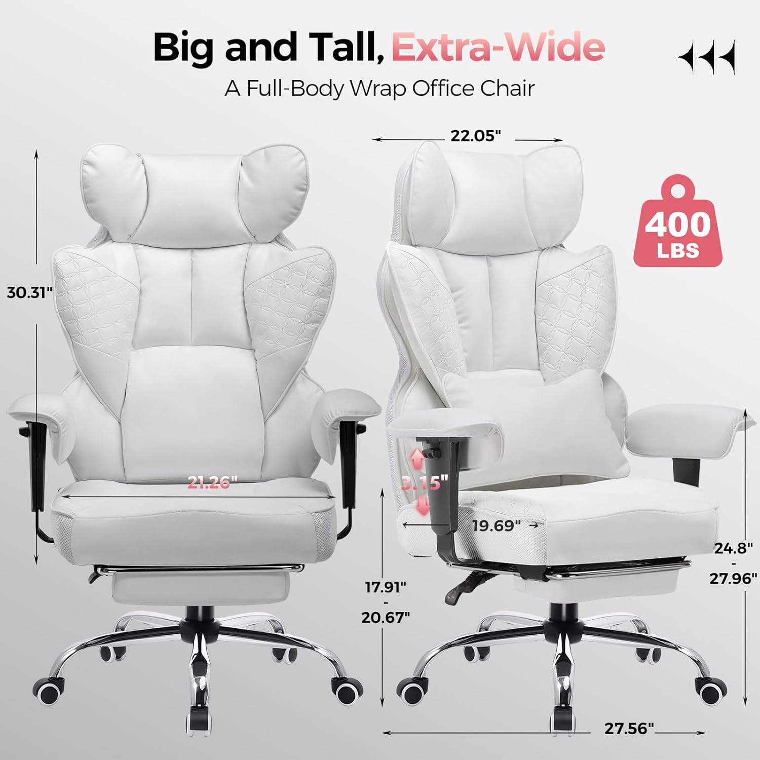 - 【400LBS Big and Tall Office Chair】Designed specifically for heavy people, Thicken and enlarged size headrest greatly improves the contact area perfectly supporting your head and neck.The prominent sides of the backrest wrap around your back better to support it on both sides and reduce pains and pressure. 400lbs weight capacity fit people with different height and body type. Even if you are big and tall, you also can get a comfortable sitting experience
