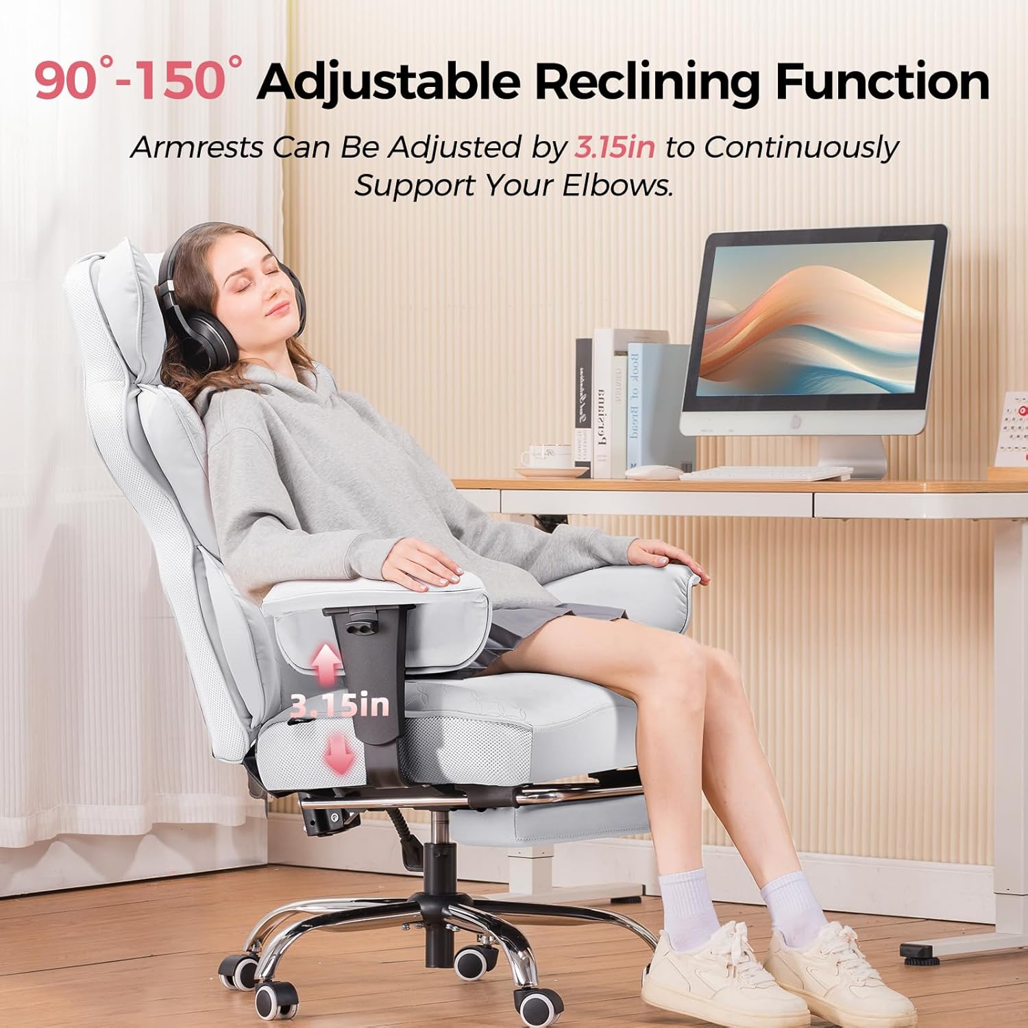 - 【Stable and Durable Construction】The frame of this oversized desk chair is made of sturdy metal, built to with stand the test of time, the heavy duty office chair features a 3-level gas lift and heavy duty metal base. This luxury office desk chair offers unwavering stability and eliminates the worry of gradual sinking. The backrest reclines from 90° to 150°, meeting the needs of work, reading, entertainment, and relaxation.