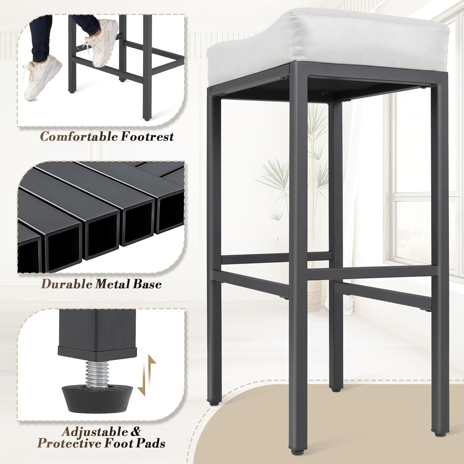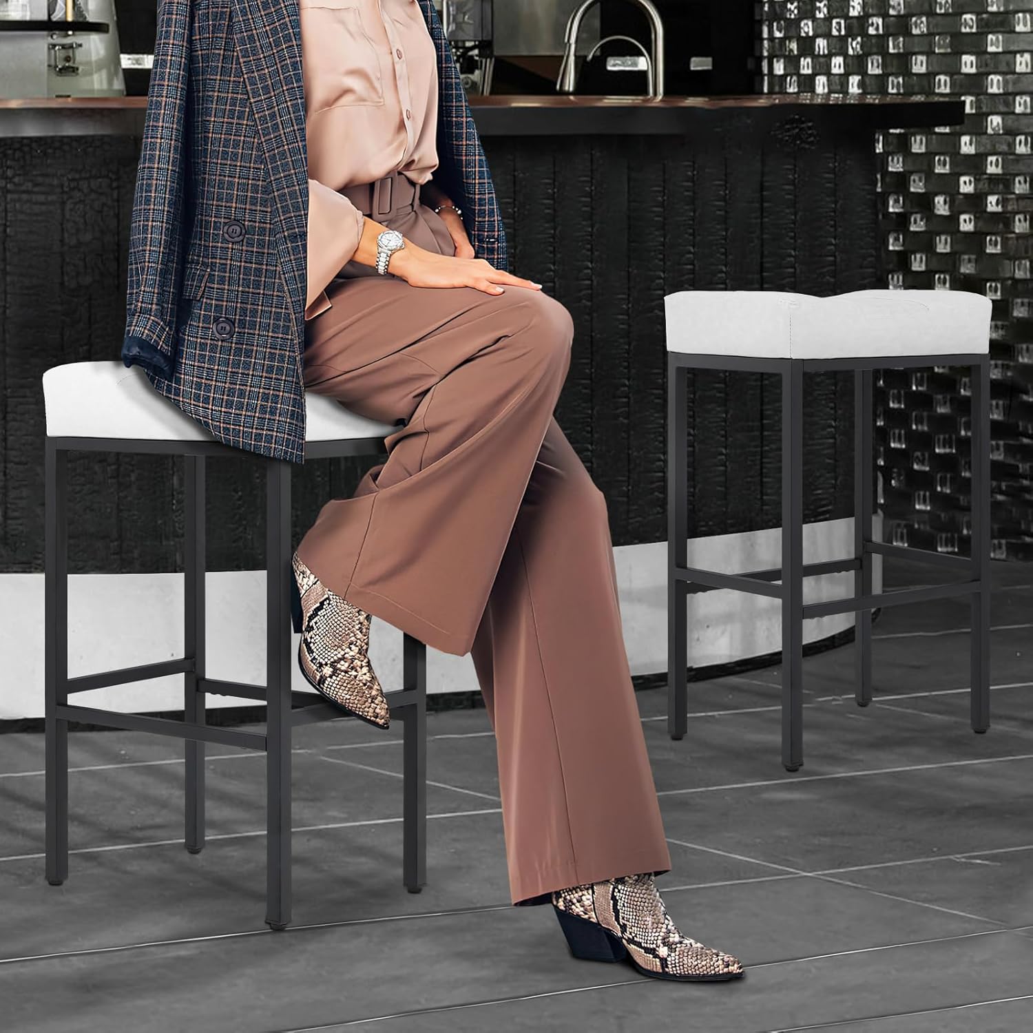 Athena Collection Counter Height Bar Stools Set of 2, 31.5 Inches Saddle Bar Stools with Leather Upholstered and Metal Legs, Backless Barstools for Counter, Kitchen Island, Dining Room, White