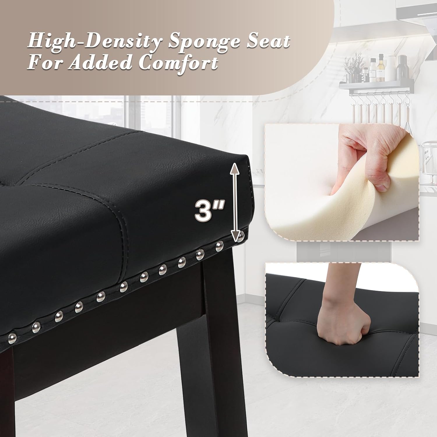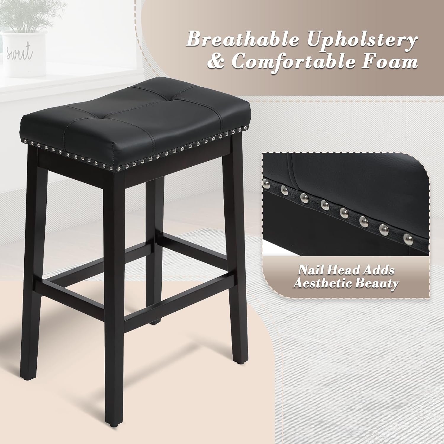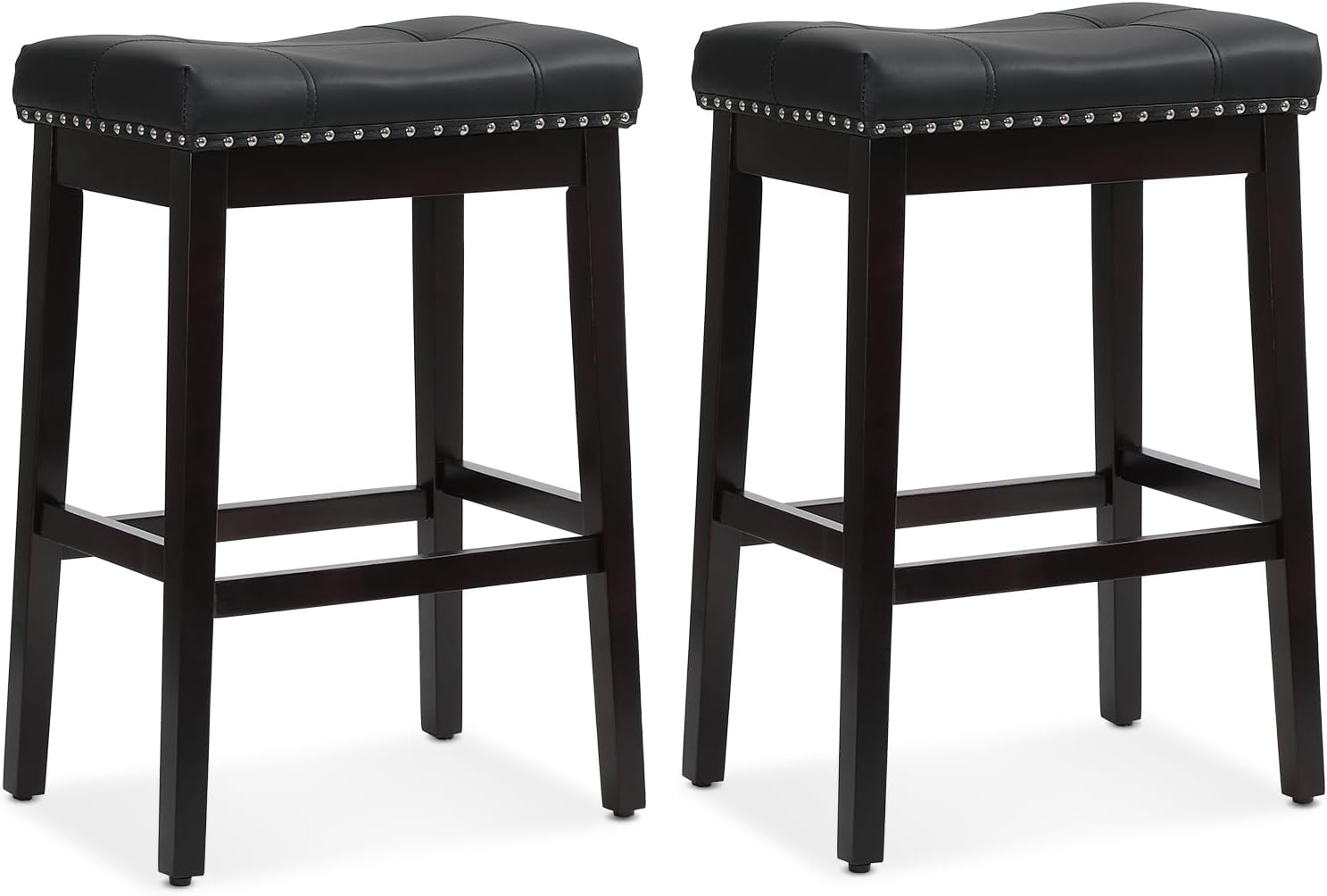 Athena Collection Counter Height Bar Stools Set of 2, 29.5 Inches Backless Saddle Bar Stools with Leather Upholstered and Nailhead Trim, Barstools for Counter, Kitchen Island, Dining Room, Black