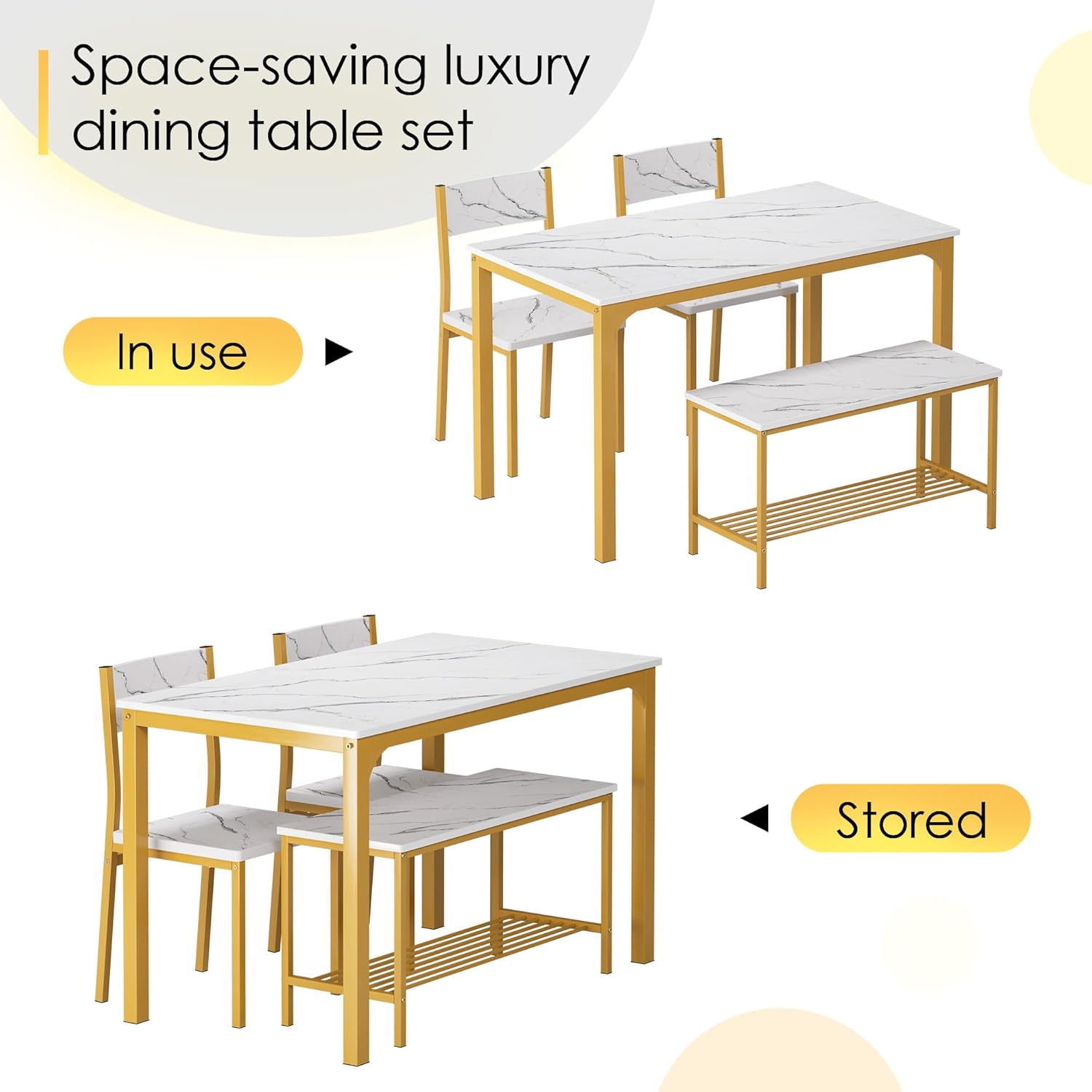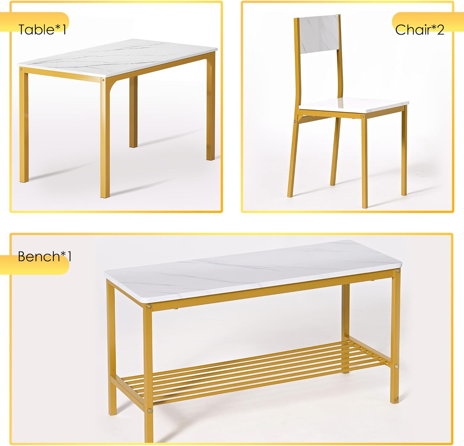 soges 4-Piece Dining Table Set with Bench - 4 Person Kitchen Table and 2 Chairs for Small Spaces, Apartment - Metal Frame & Woodgrain Tabletop, Space-Saving Design, Durable & Easy to Clean, Gold