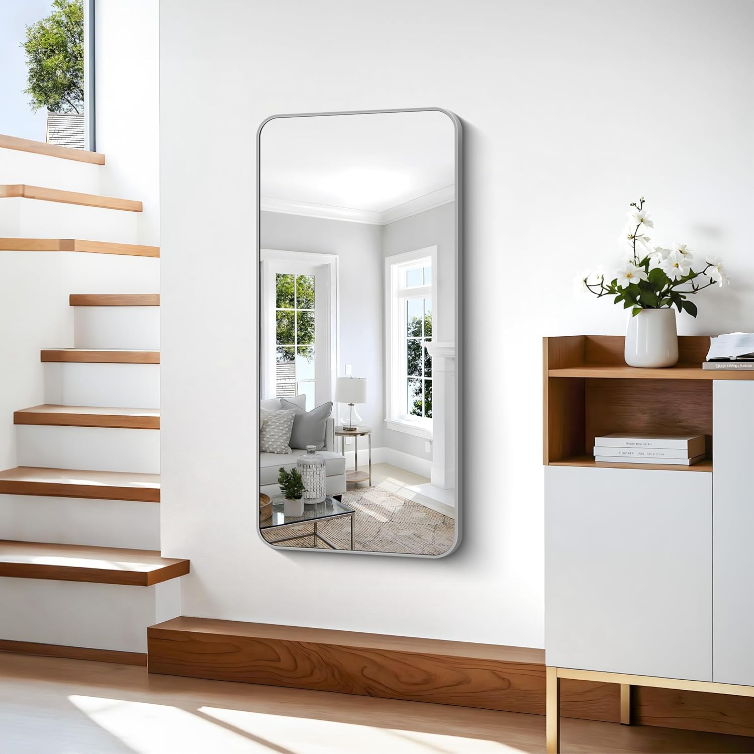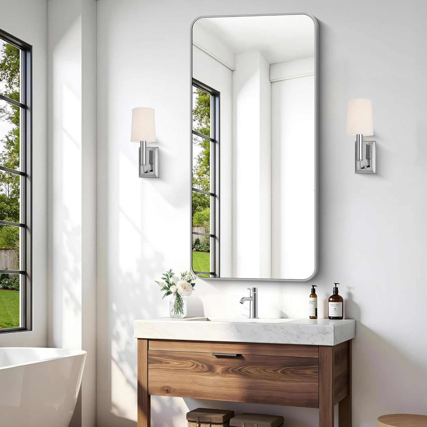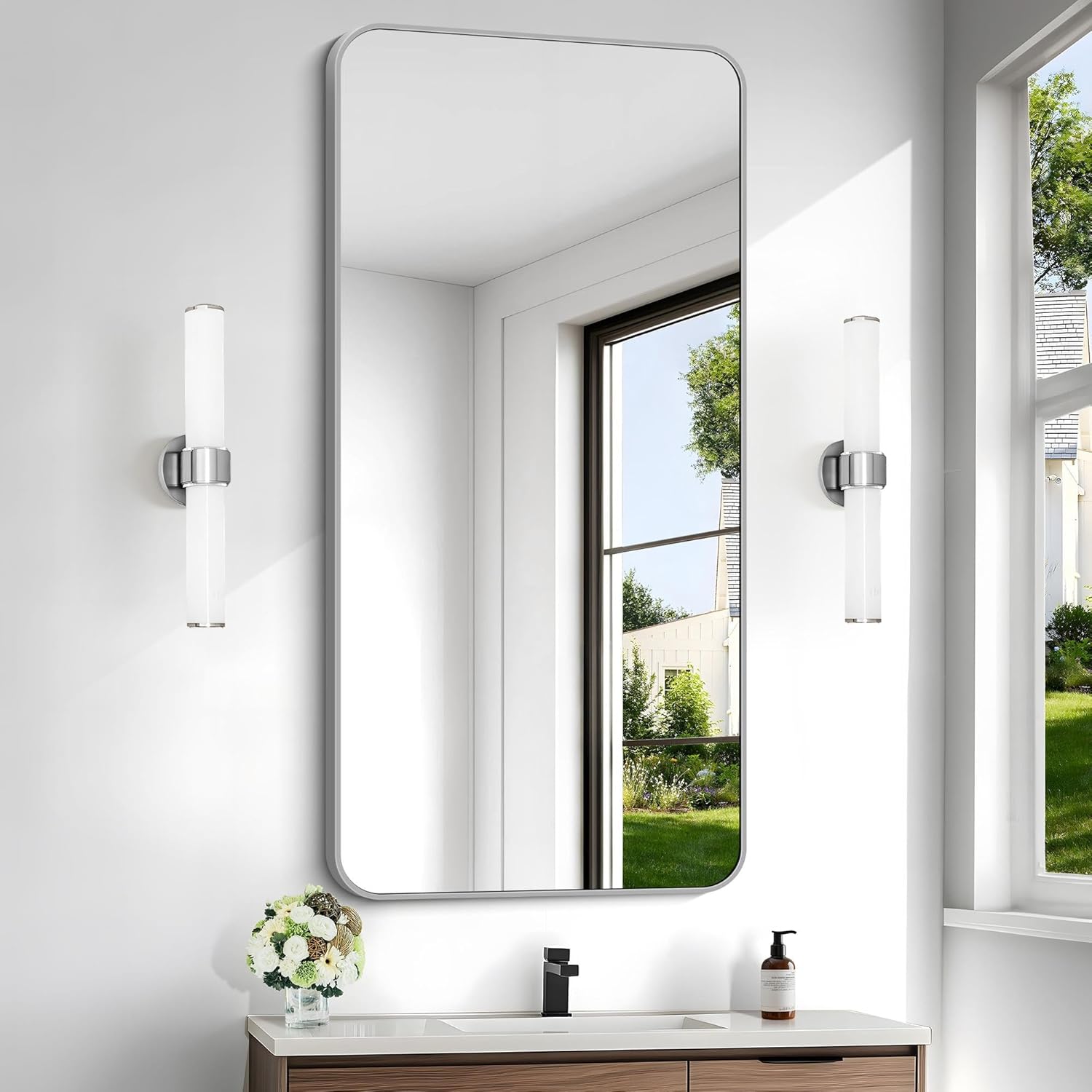 - MODERN STYLE SILVER BATHROOM MIRROR: The dimensions of this bathroom mirror is 24 x 48 inch, perfect size for you to get a true and reliable images at multiple angles and distances. Designed minimalist modern style combine practicality and aesthetics. Suitable for anywhere a mirror might be needed. Such as bathroom, cloakroom, dressing room, living room, bedroom, entryway. Bring more style and brightness to your home. It's also a wonderful housewarming gift for friends and families.