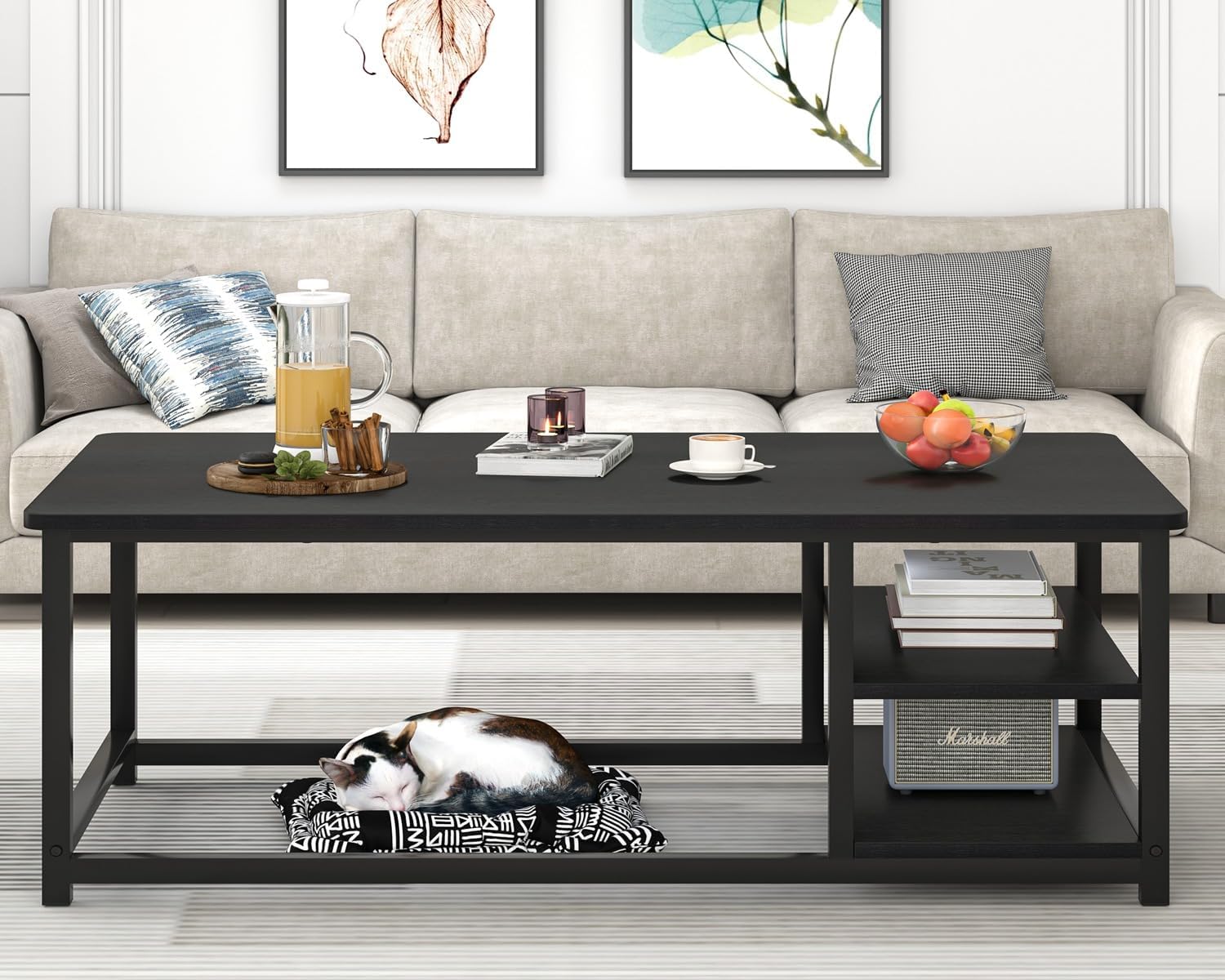 EXCEFUR Black Coffee Table, Rustic Wood Living Room Table with Storage Shelf, Modern Rectangle Center Table, 47 Inch