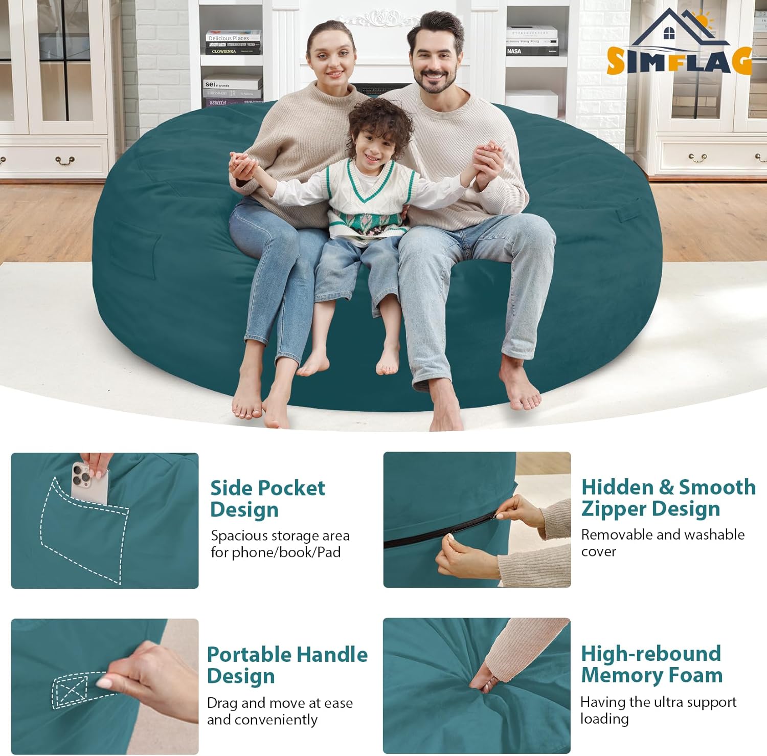 7FT Bean Bag Chair, Large Bean Bag Chairs with Memory Foam Filled, Fluffy Beanbag Sofa with Dutch Velvet Cover, Round BeanBag Chairs for Living Room, Playroom - Sea Blue