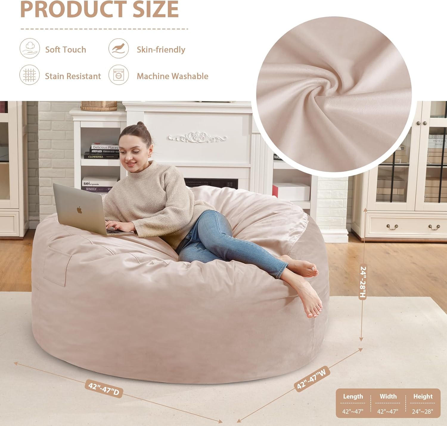 4FT Bean Bag Chair, Large Bean Bag Chairs with Memory Foam Filled, Fluffy Beanbag Sofa with Dutch Velvet Cover, Round BeanBag Chairs for Living Room, Playroom - Beige