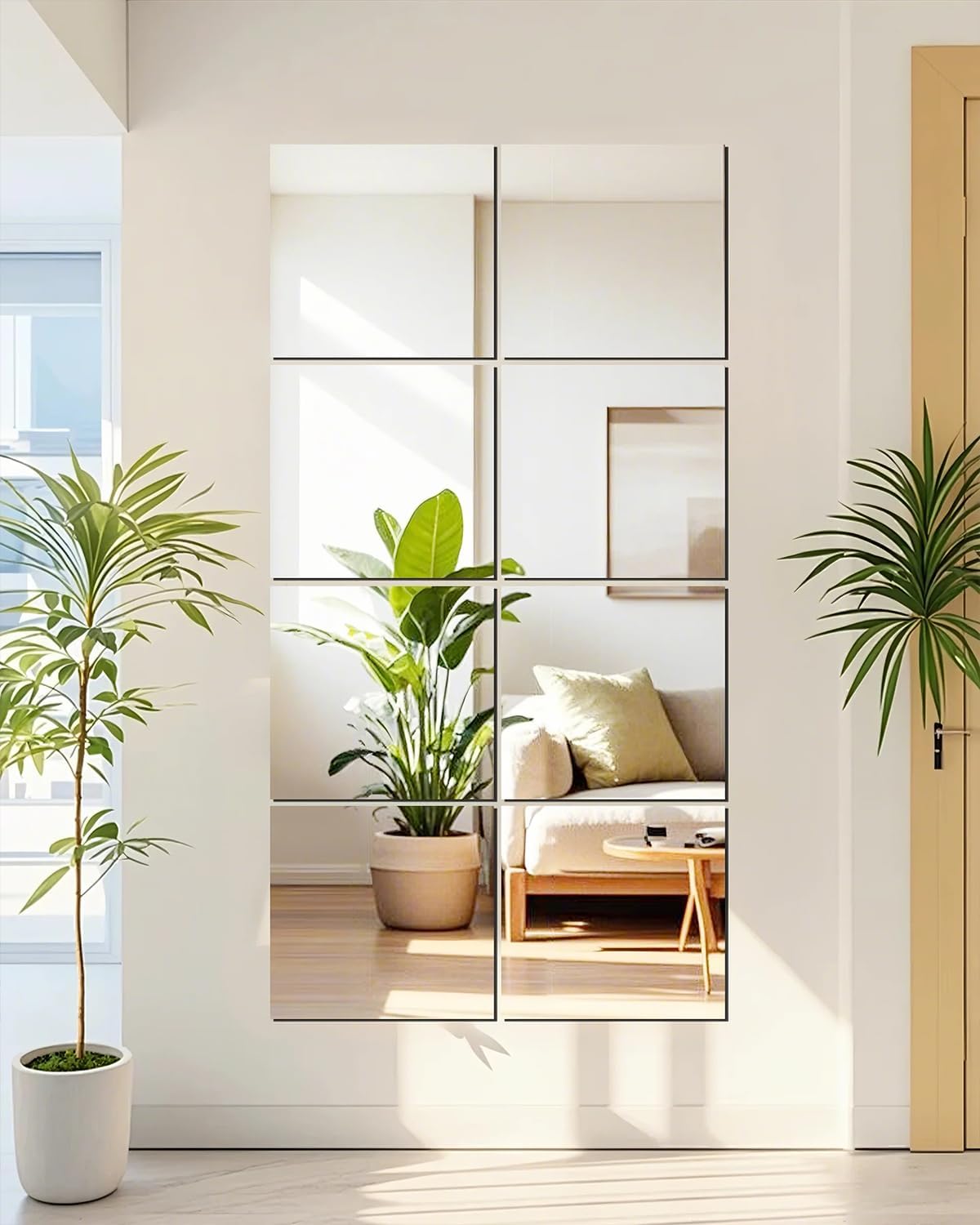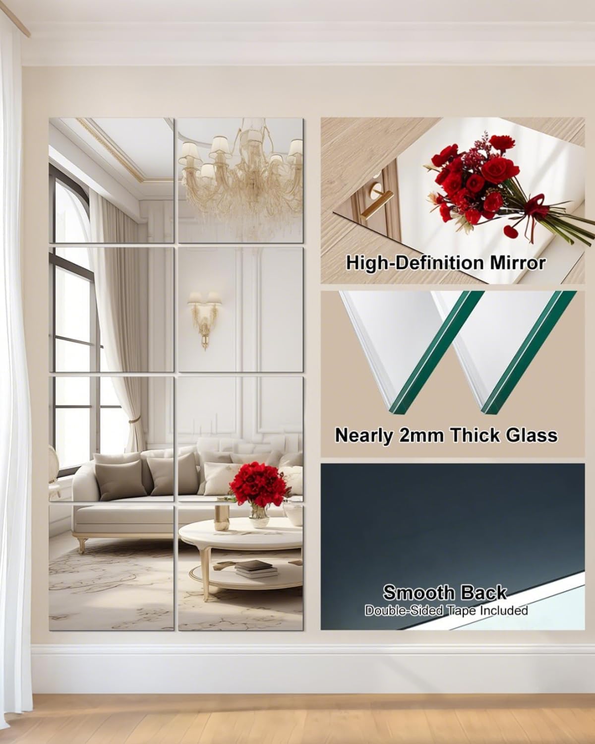 Glass Mirror Tiles for Wall 12" x 12" Frameless Full Length Mirror Wall Mounted Full Body Mirrors for Bedroom Home Gym Door Bathroom (8PCS)
