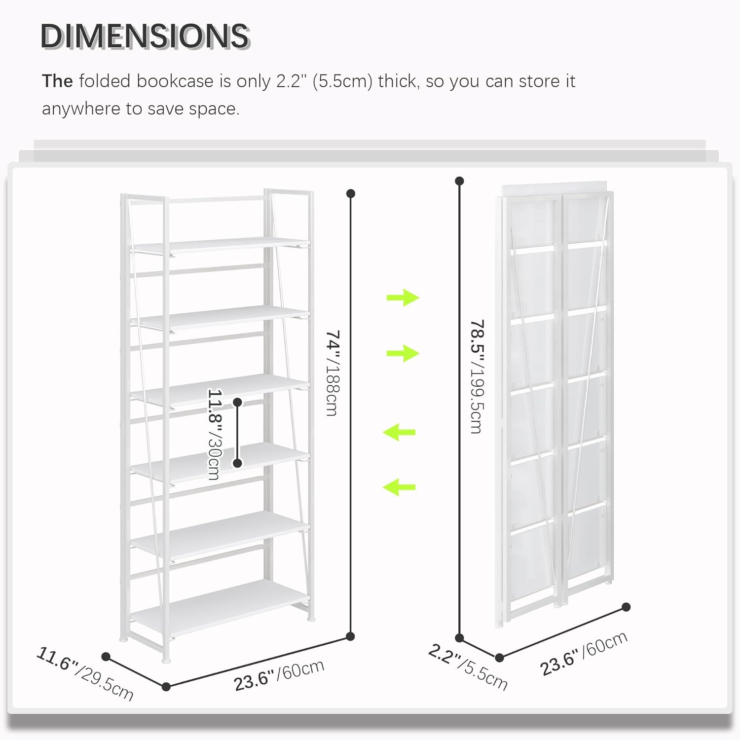 4NM No Assembly Folding Bookshelf, 6-Shelf 74" H Collapsible Foldable Bookcase Storage for Small Spaces, All White