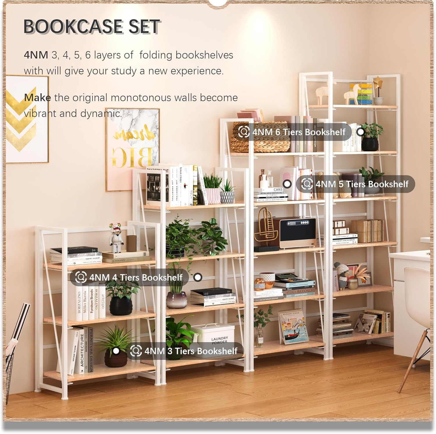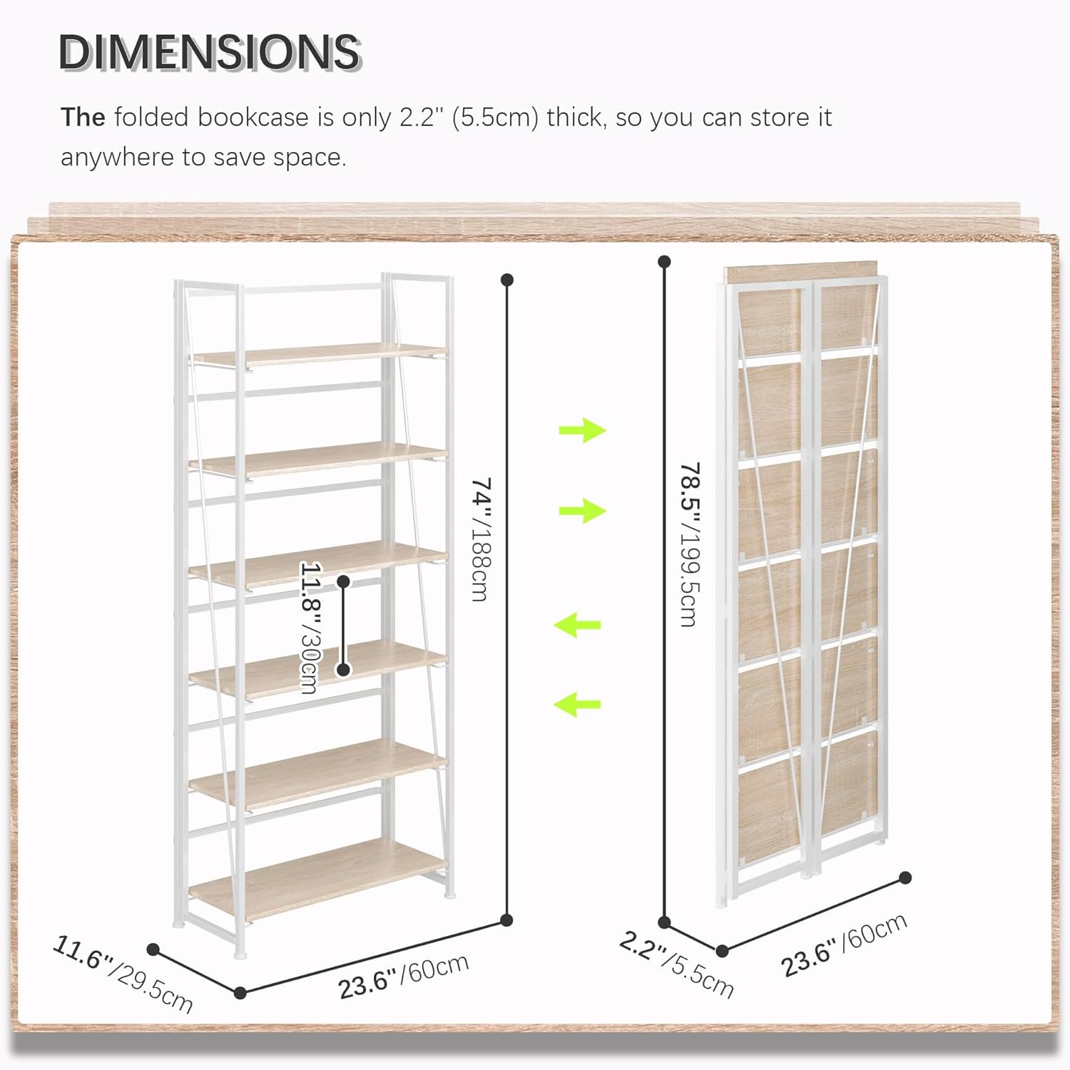 4NM No Assembly Folding Bookshelf, 6-Shelf 74" H Collapsible Foldable Bookcase Storage for Small Spaces, Natural White