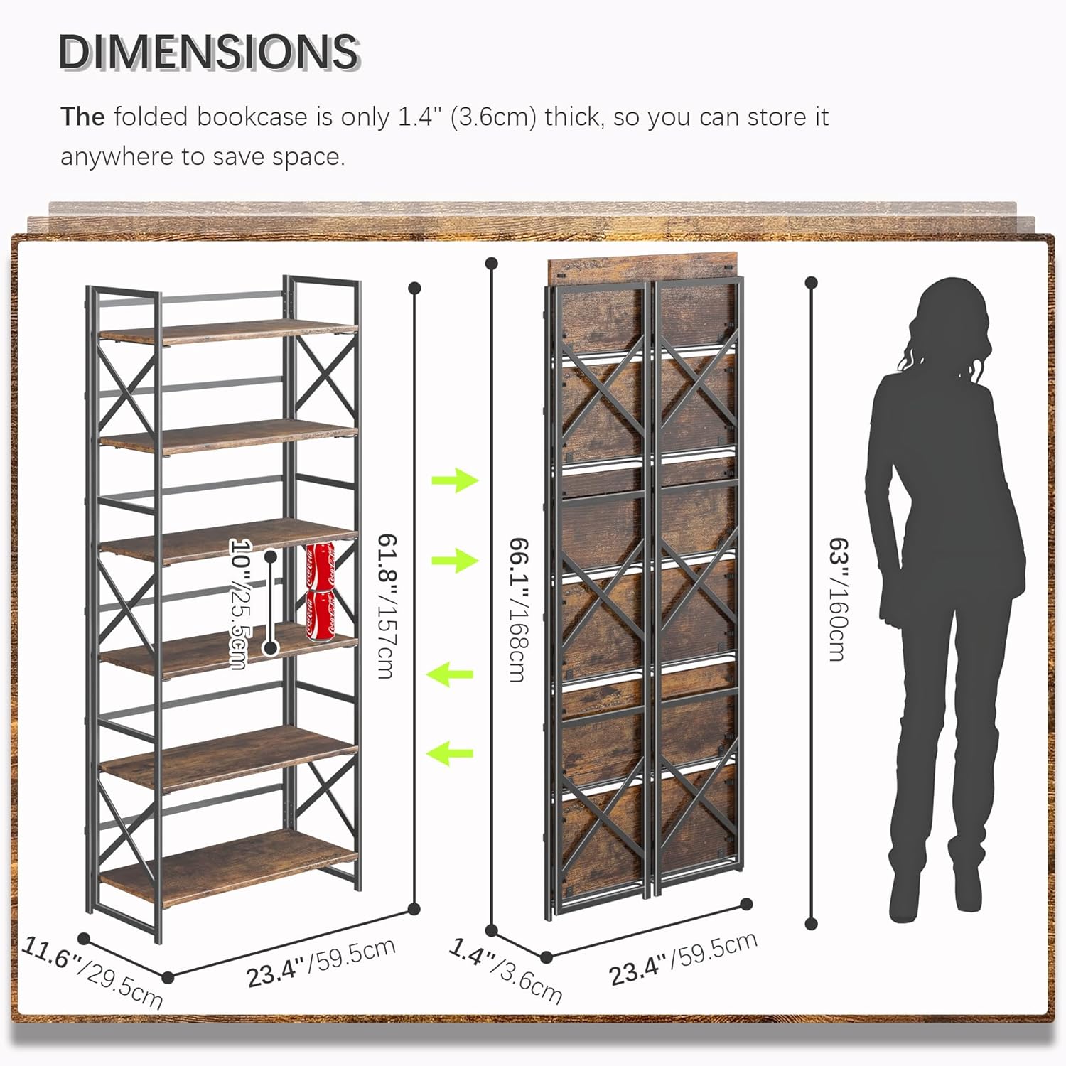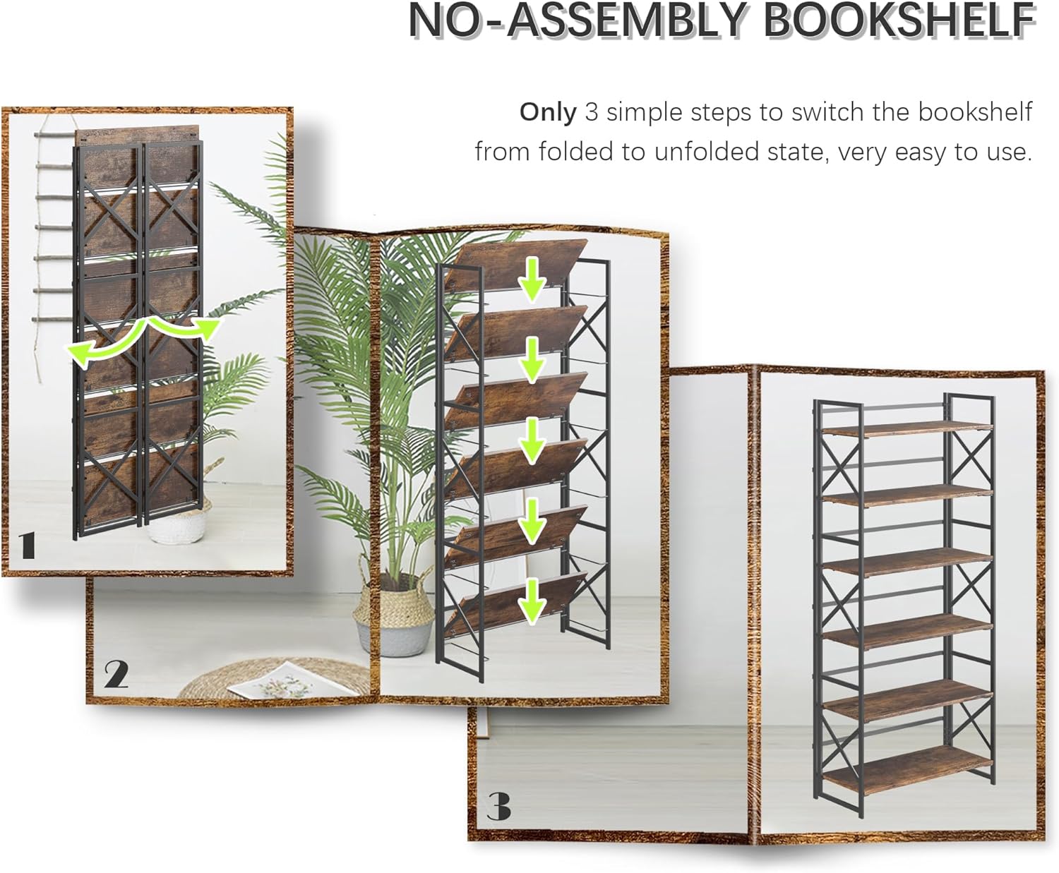 4NM 6 Tiers No Assembly Book Shelves, 61.8" H Folding Bookshelf Bookcase Open Industrial Foldable Shelves for Bedroom, Living Room, Home Office - Rustic Brown Black