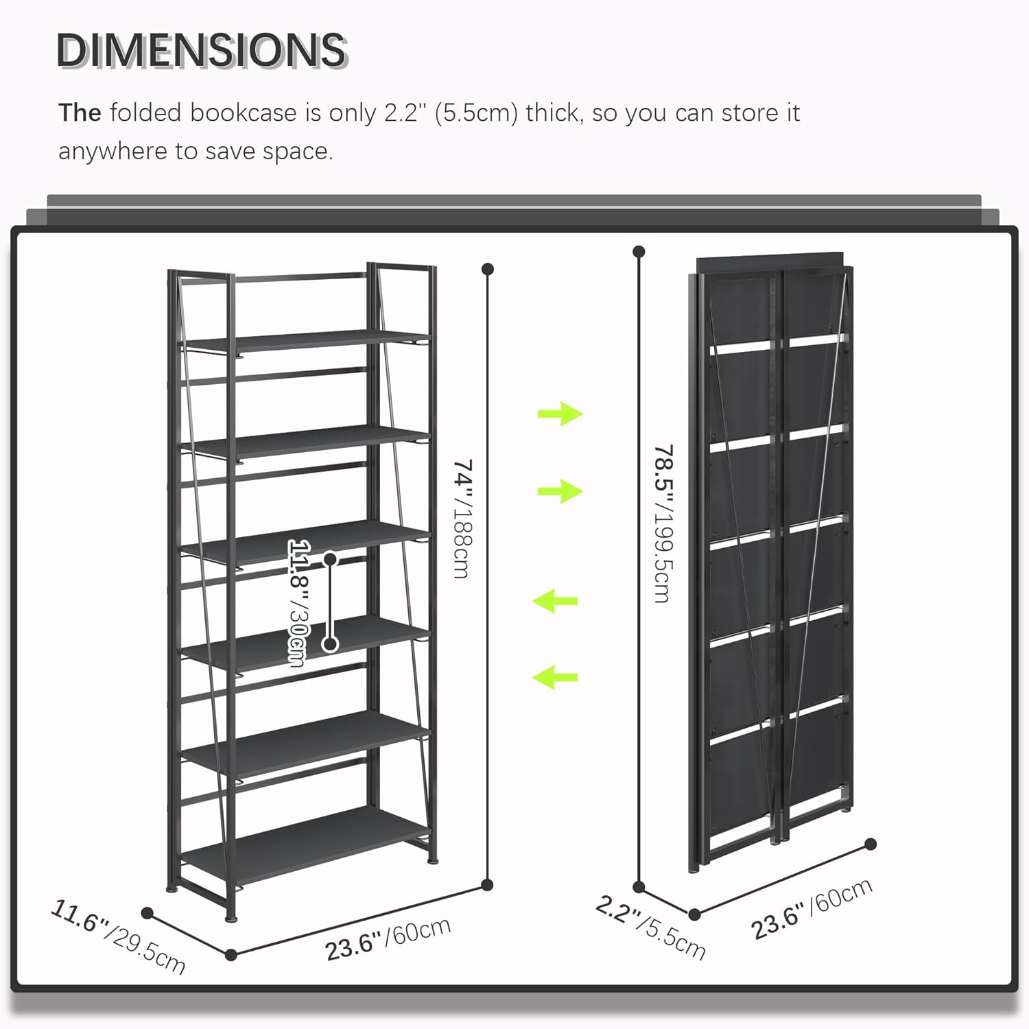 4NM No Assembly Folding Bookshelf, 6-Shelf 74" H Collapsible Foldable Bookcase Storage for Small Spaces, All Black