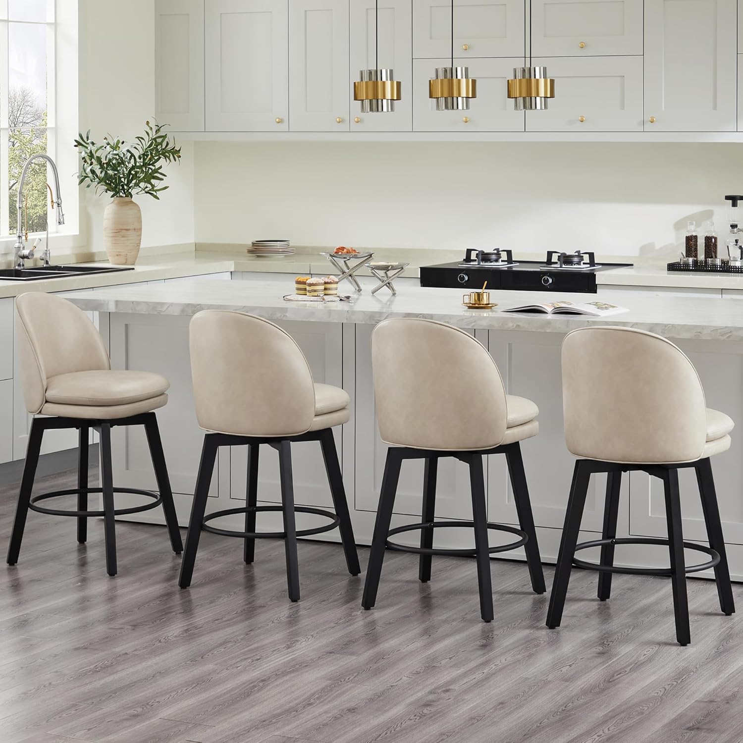 Counter Height Barstools 26 inch Upholstered Swivel Bar Stools with Back and Wood Legs for Kitchen Island,Set of 3,Beige PU Leather-Armless
