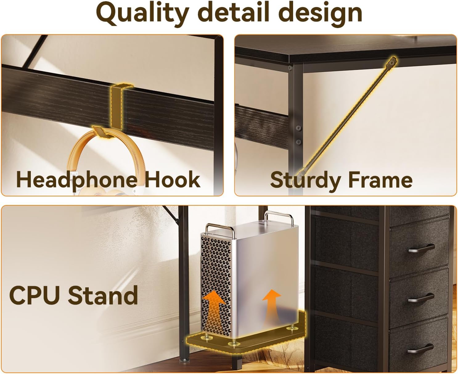 - ăCPU Stand & Convenient Hookă The computer desk equipped with a dedicated CPU stand to securely hold your computer tower or store other items, keeping your setup neat and dust-free. Plus, the Iron hook is perfect for hanging headphones, bags, or cables, ensuring everything stays within reach. A must-have for gaming or remote work setups! Perfect for kids' desks or computer desks
