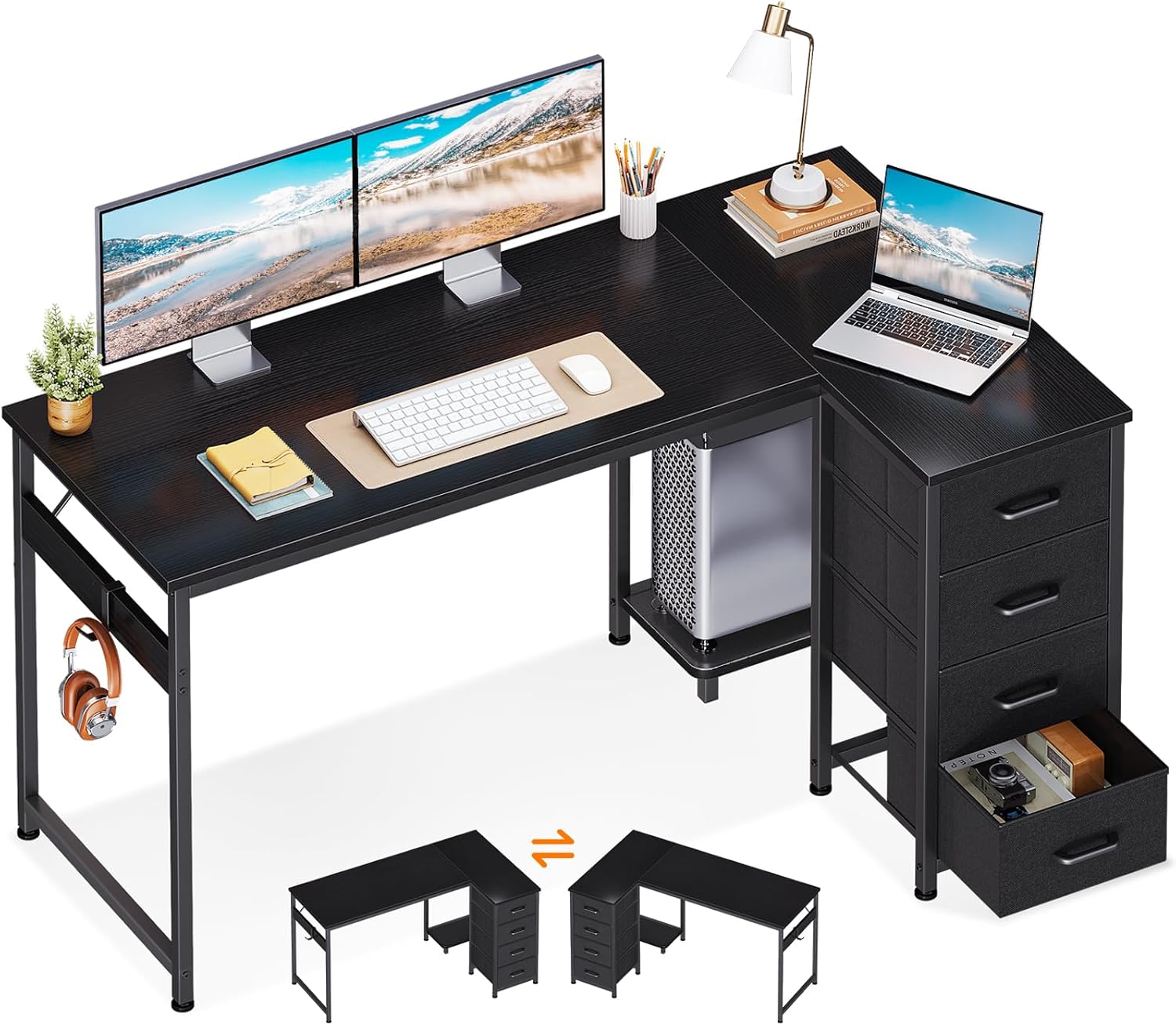Casaottima L Shaped Desk with 4 Drawers, 47" Corner Computer Desk with Storage, Reversible Kids Study Table with CPU Stand & Hook, Work Table for Home Office, Black