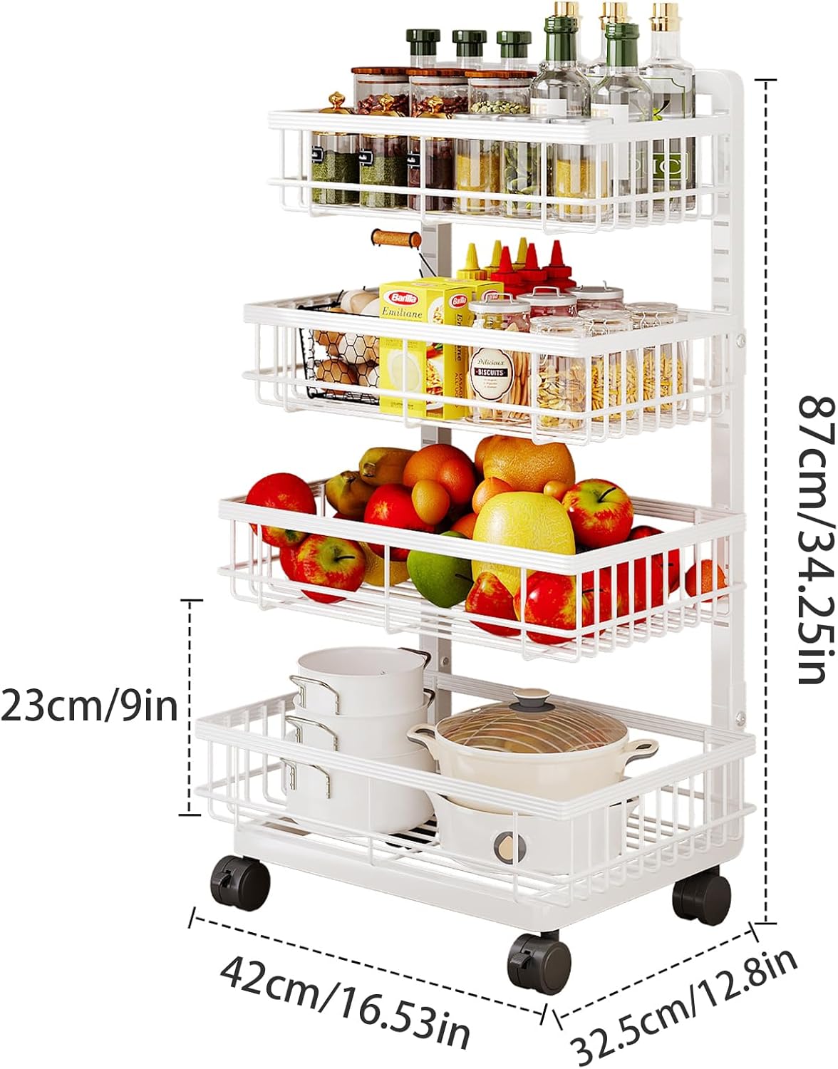 - Adjustable Storage Solution: Featuring 4 spacious, adjustable, and removable baskets, this versatile metal storage cart allows you to organize your items in the way that works best for you. From using it as a fruit and vegetable basket rack in the kitchen to a mobile snack cart in your pantry or a bathroom organizer, this rolling cart maximizes your storage potential while offering a flexible solution to suit your needs. Perfect for creating a personalized storage setup in any space