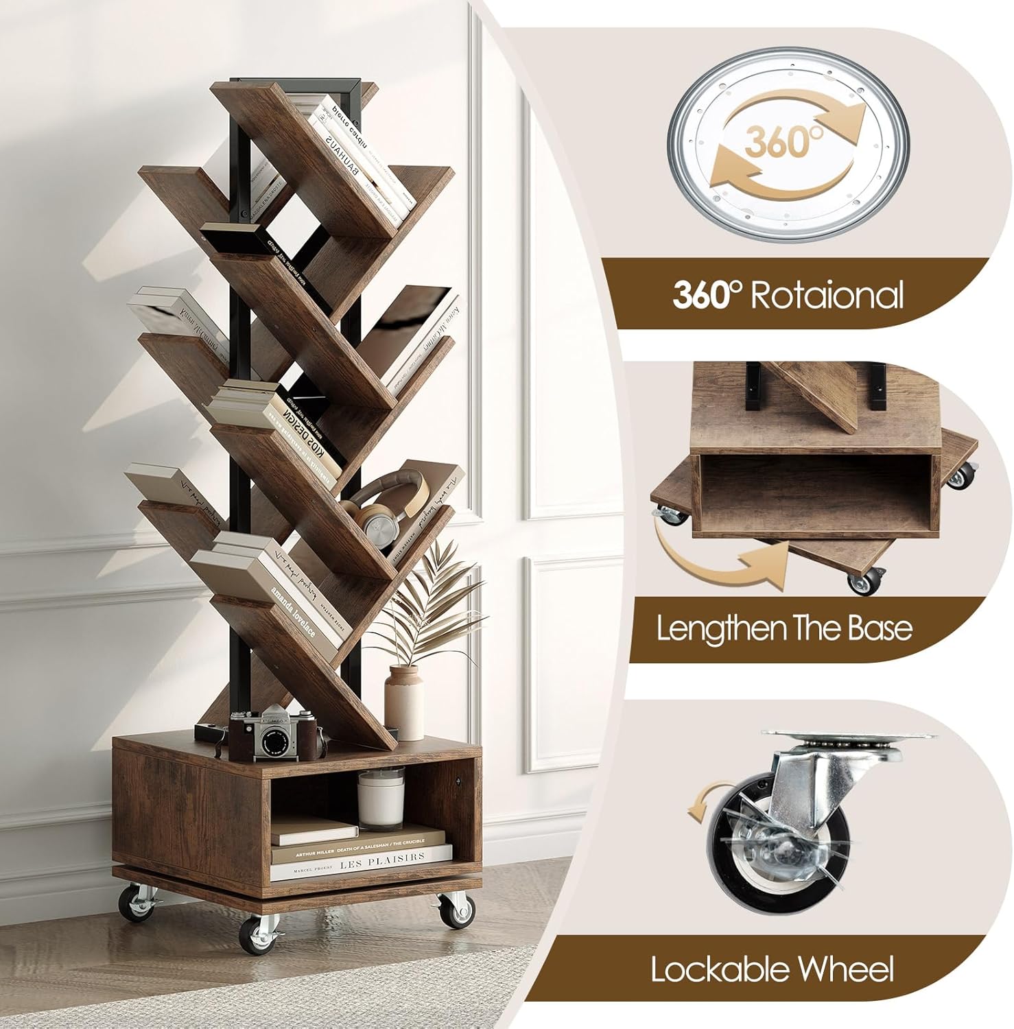 - Modern & Convenience: Combining vintage colors with a modern tree design, this bookcase adds a warm, stylish personality to any decor.Lockable casters ensure easy mobility and safety during regular use, guaranteeing the safety of children and pets.