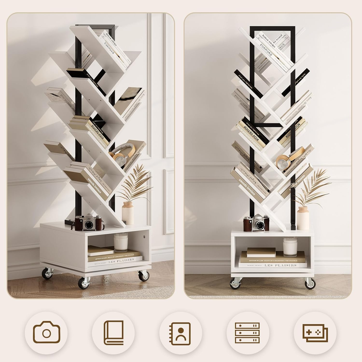 - Modern & Convenience: Combining vintage colors with a modern tree design, this bookcase adds a warm, stylish personality to any decor.Lockable casters ensure easy mobility and safety during regular use, guaranteeing the safety of children and pets.