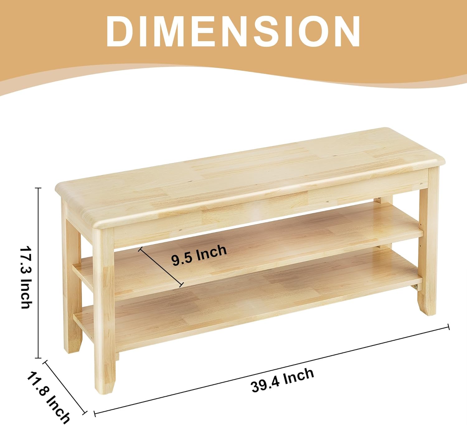 - 【Bench with Shoe Storage】Product dimensions: 39.4"W x 11.8"D x 17.3"H. The 3 tier shoe rack can effectively store shoes of various types and sizes. Suitable for entrances, hallways, closets, bedrooms and more. This wooden shoe rack easily blends into any home décor. Plus, this shoe bench comes with anti-scratch feet, so no more scratched floors and noisy movement.