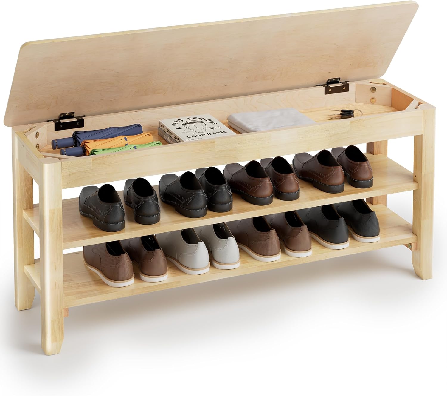Shoe Storage Bench for Entryway - 3 Tier Shoe Rack for Front Door Entrance, Rubberwood Shoes Rack Height Adjustable, Entryway Bench with Shoes Storage for Any Room (Natural, 39.4" W)