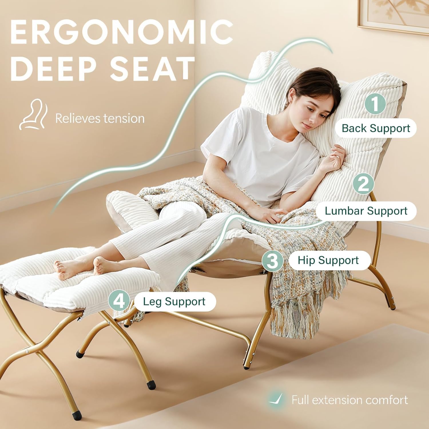 - STRONG STRUCTURAL FRAME: This chaise lounge has a strong metal frame that reinforces the structural support, making it more stable and reliable, the frame is not easy to break, more durable, and the foot pads on the chair frame not only prevent the chair from tilting and sliding, but also protect the floor from scratches.