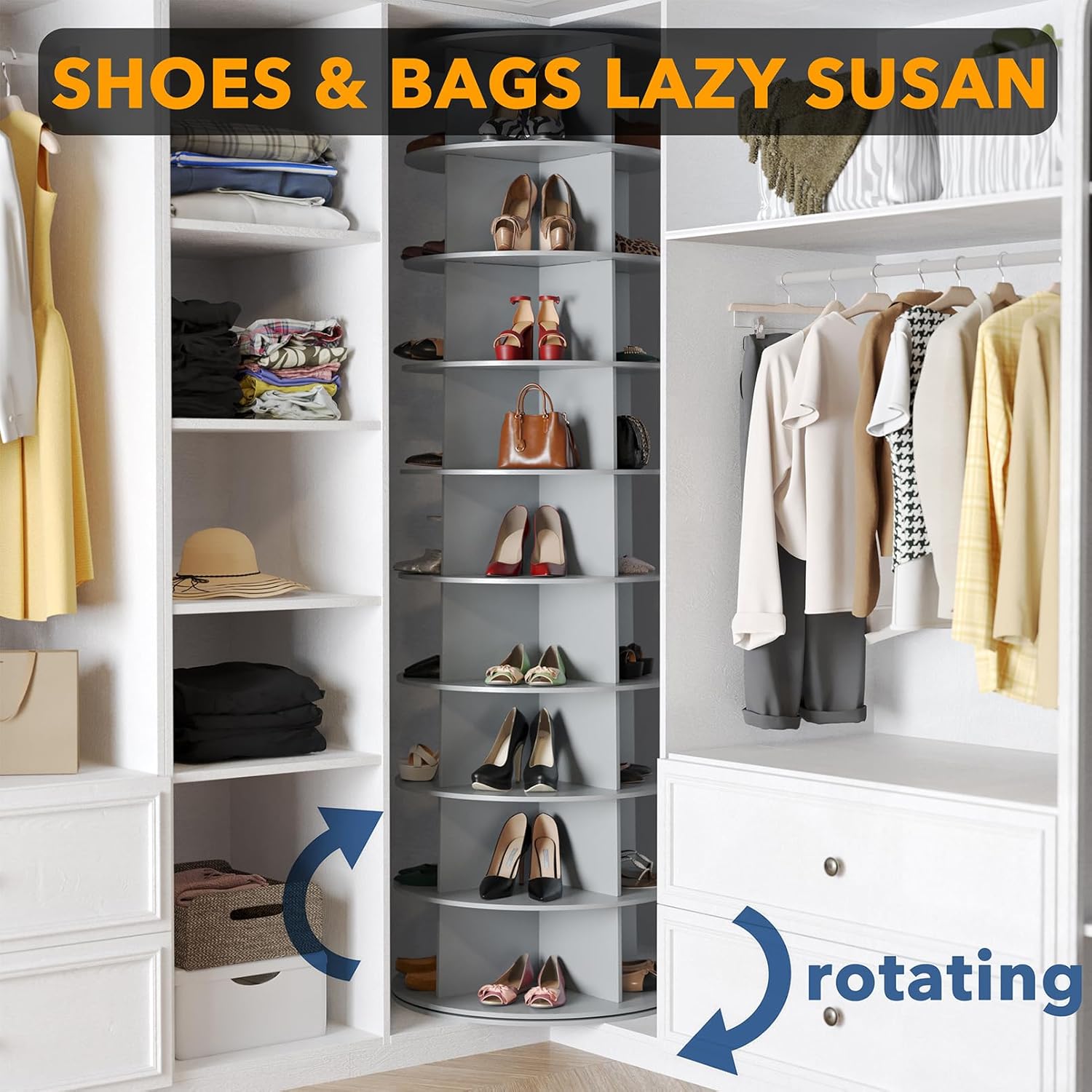 - ORGANIZED AND BEAUTIFUL - Make your shoes neat and organized with this rotating shoe rack tower lazy susan; The space saving design can hold up many shoes or bags in a compact space; SIZE: 23.2"W x 23.2"D x 80.7"H