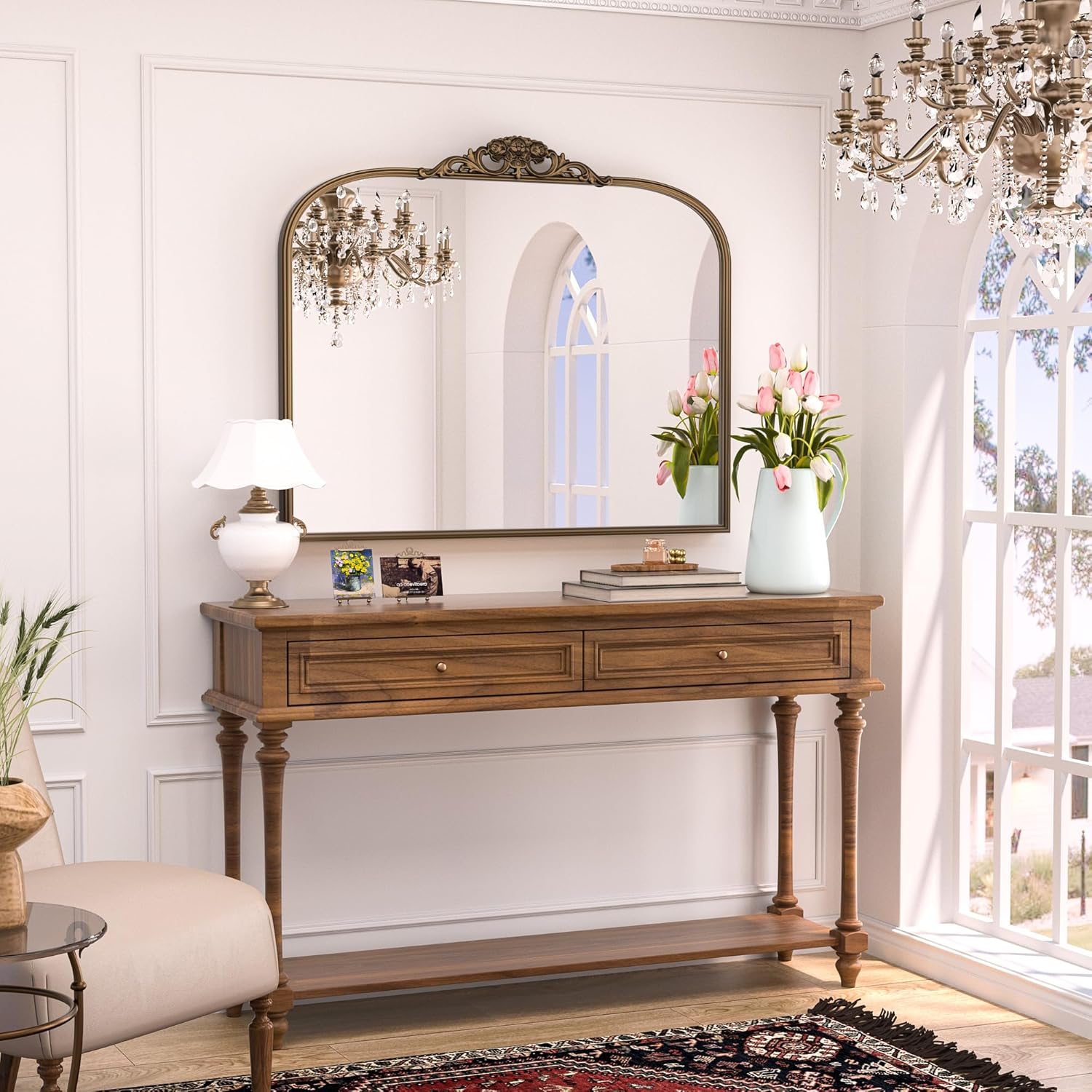 - 【Baroque-inspired Charm】 Keonjinn Antique Arched Mirror is a timeless piece designed to elevate your wall décor. Inspired by the opulence of the Baroque era, this mirror exudes historical charm with its graceful arched design and intricate wooden floral crown, creating a captivating focal point in any room.