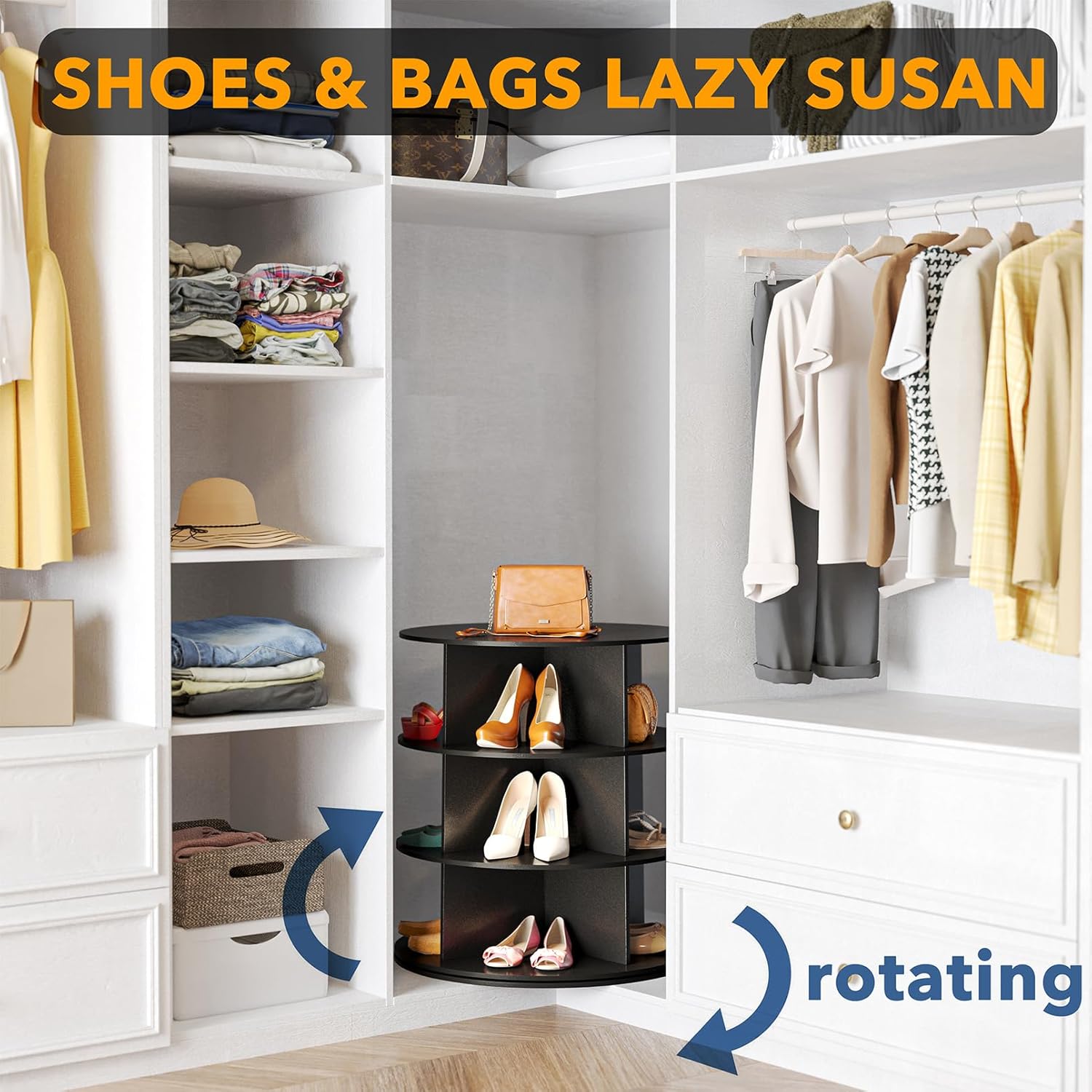 - ORGANIZED AND BEAUTIFUL - Make your shoes neat and organized with this rotating shoe rack tower lazy susan; The space saving design can hold up many shoes or bags in a compact space; SIZE: 23.2"W x 23.2"D x 27.6"H
