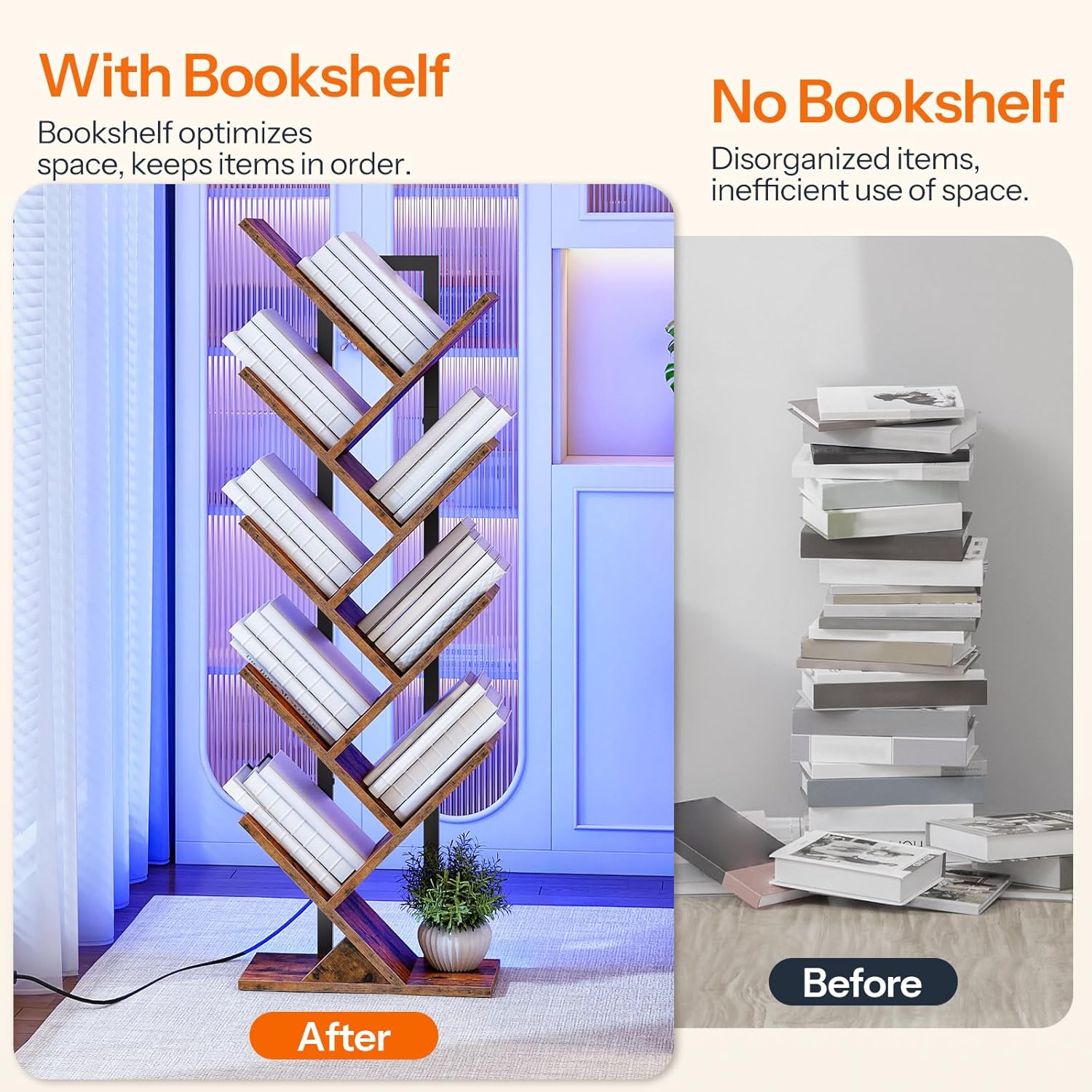 - Space-Saving, Organize with Ease: Despite its sleek design, this 9-tier tree bookshelf with 9 shelves can hold 5-10 books per shelf, helping keep your books, magazines, and collectibles neatly organized without taking up too much room