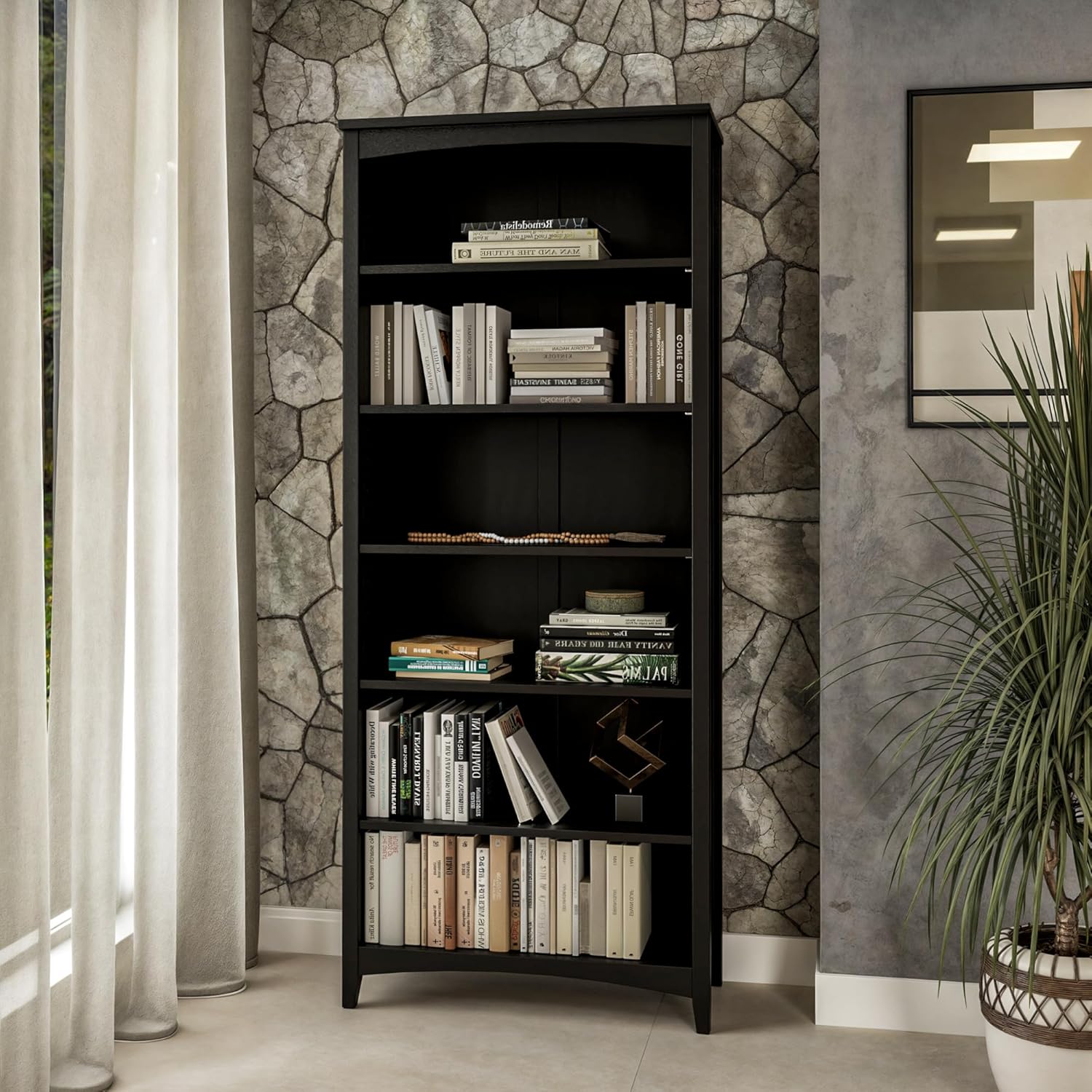 Camaflexi Shaker Style 6 Shelf Bookcase/Solid Wood / 72 inch Tall/Adjustable Shelving/Closed Back/Display Bookshelf for Living Room, Bedroom, Home and Office, Black