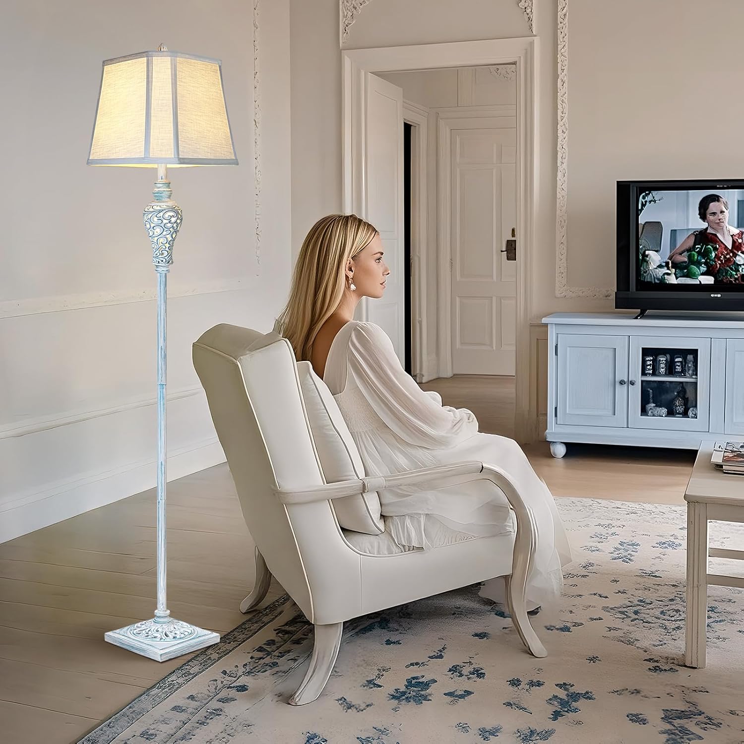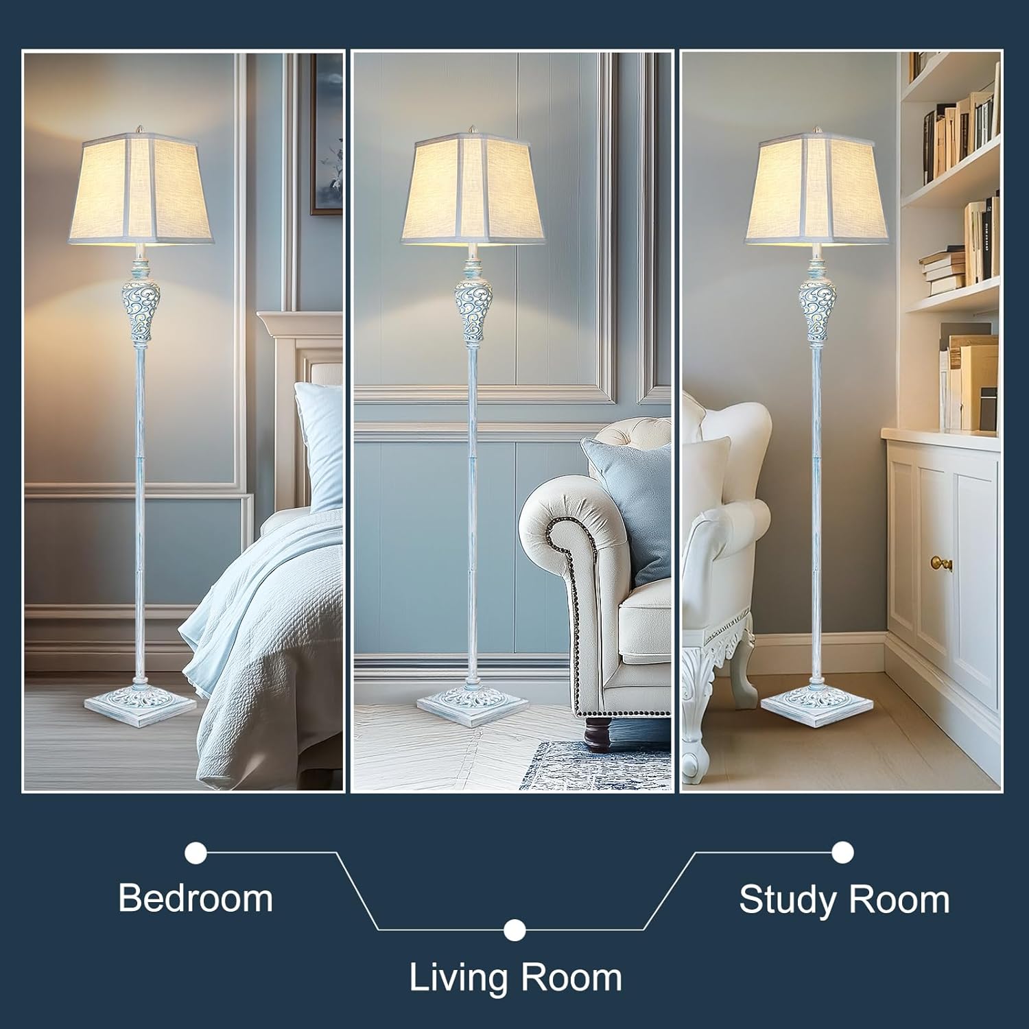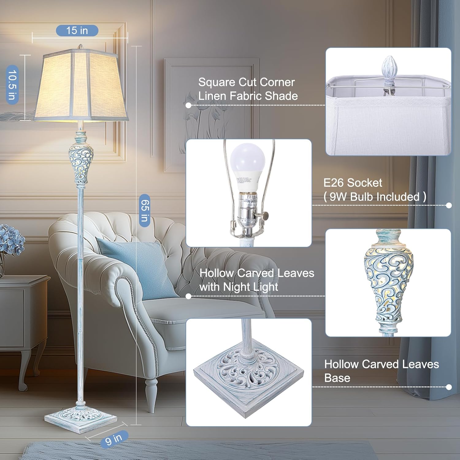 - UNIQUE DESIGNS: This farmhouse floor lamp combines vintage charm with luxurious style. Exquisite hollow carved leaves on the base and night light make it look elegant and beautiful. The lamp body is made of durable resin and metal with washed blue finish.