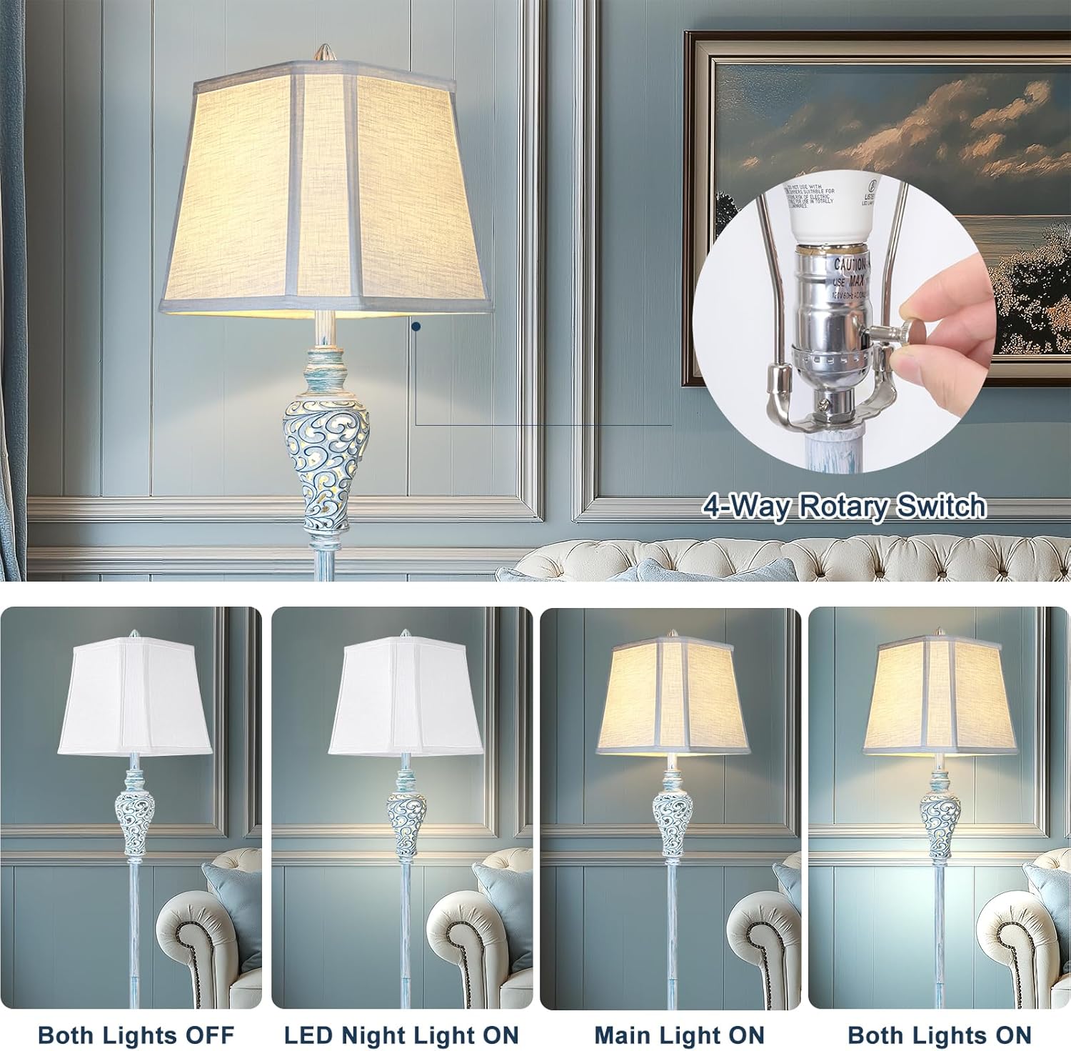 - 4-WAY ROTARY SWITCH: The main light and night light can be on separately or at the same time. Dual light source, night light includes 4W LED bulb (120V Only). You can choose different lights to accompany you and your family to read, sleep, watch TV...