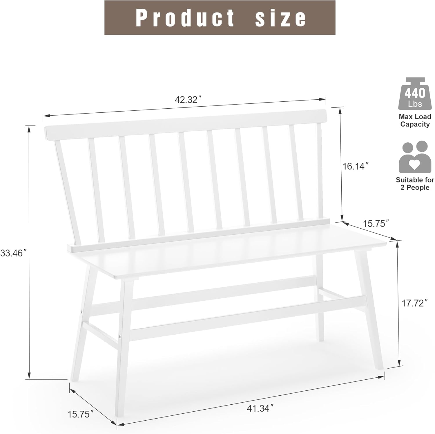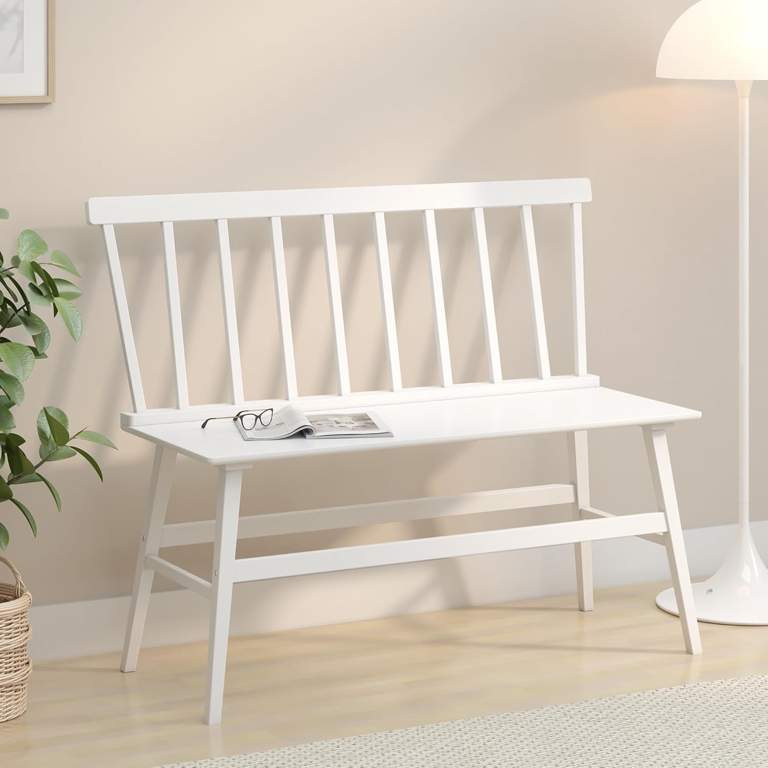 Bamboo Dining Bench, Wooden White Entryway Bench with Spindle Back Farmhouse Wood Windsor for Foyer Balcony Living Room Comfortable Winsor Chair Benches for Home